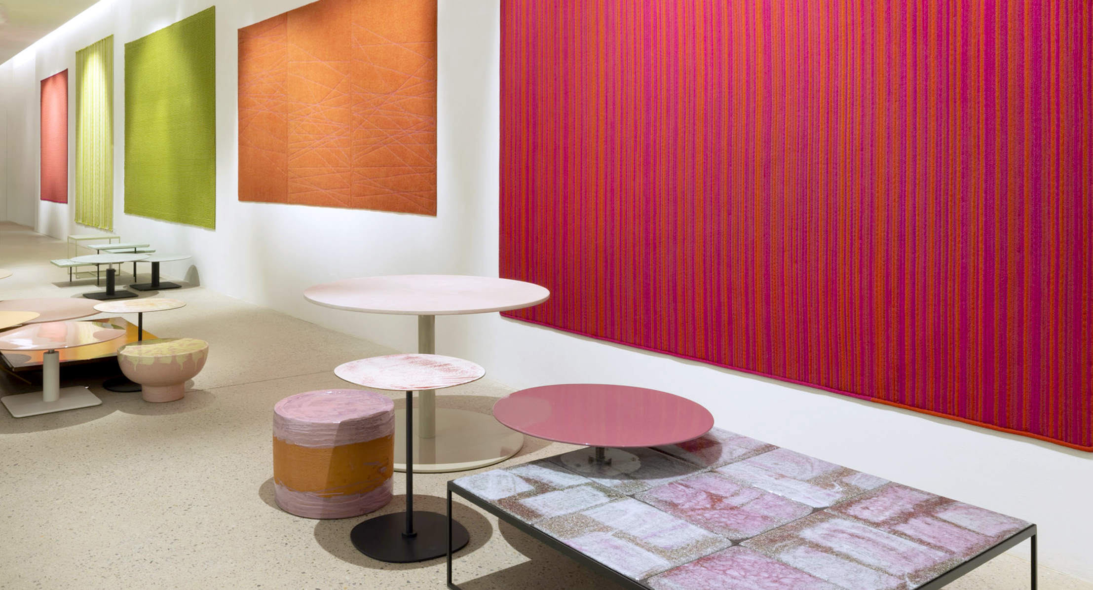 In the space dedicated to temporary exhibitions at Paola Lenti Milano, a new journey unfolds through forms, materials, and crafting techniques, creating a vibrant chromatic dialogue between vertical and horizontal surfaces.