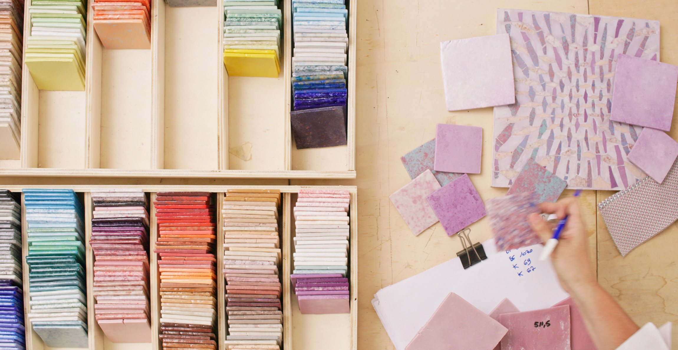 Together, they decide to subvert the traditional mosaic technique to create tesserae with different shapes and dimensions, round for example; they strip the joint of its function as a “hinge” to make it a background that recalls the chromatic palette of the collection products with which it is combined.