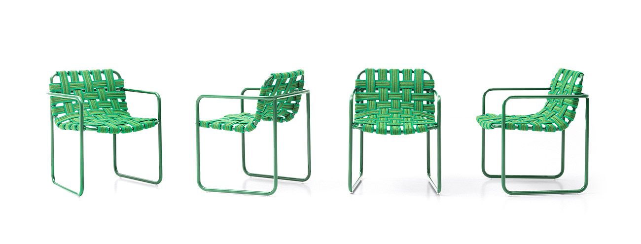 Handwoven, these belts combine elasticity and tension to create a curved and welcoming surface. The open weaves produce an empty volume, providing both body and function to the seats, along with visual lightness and a strong graphic presence.
