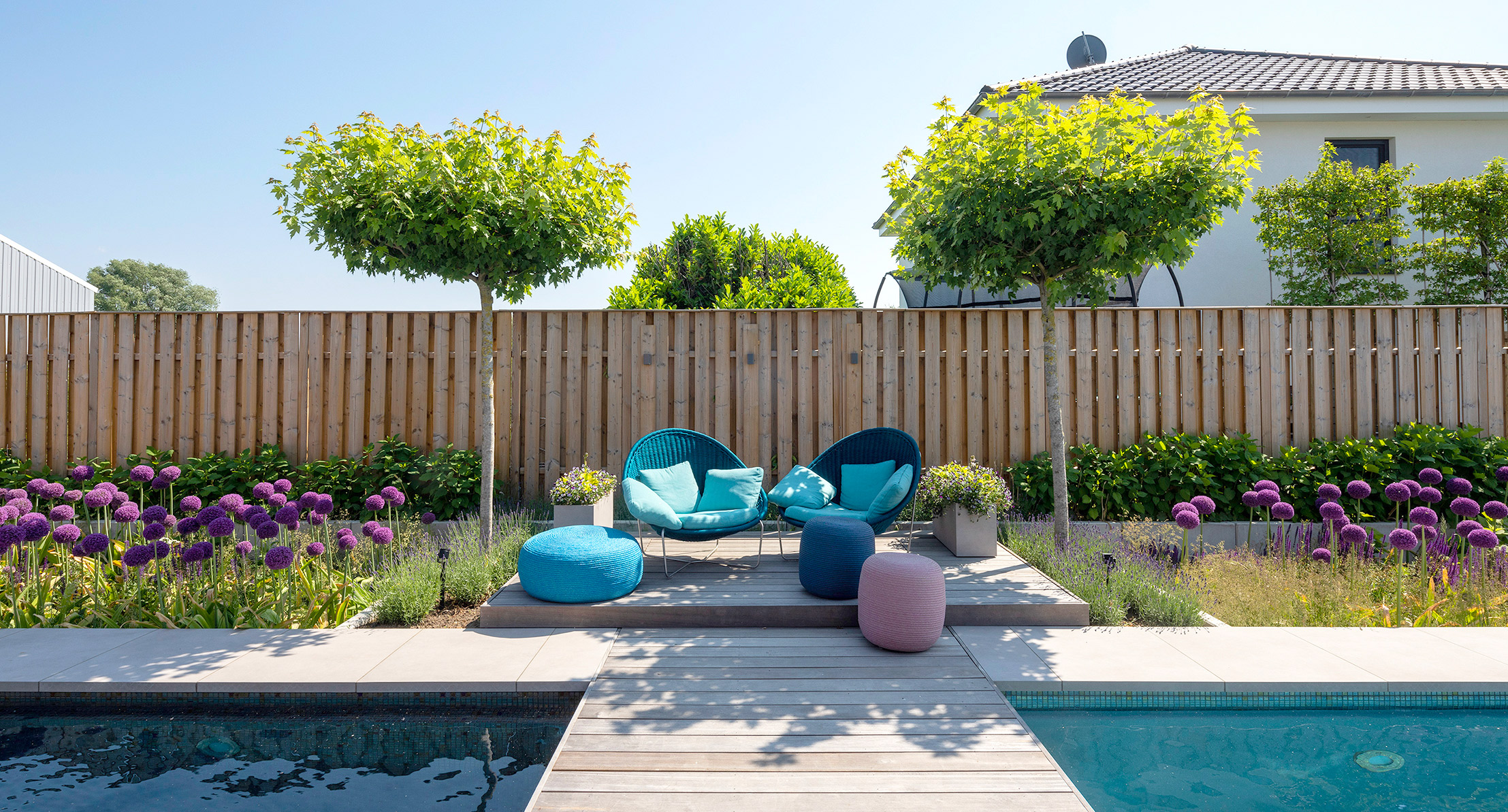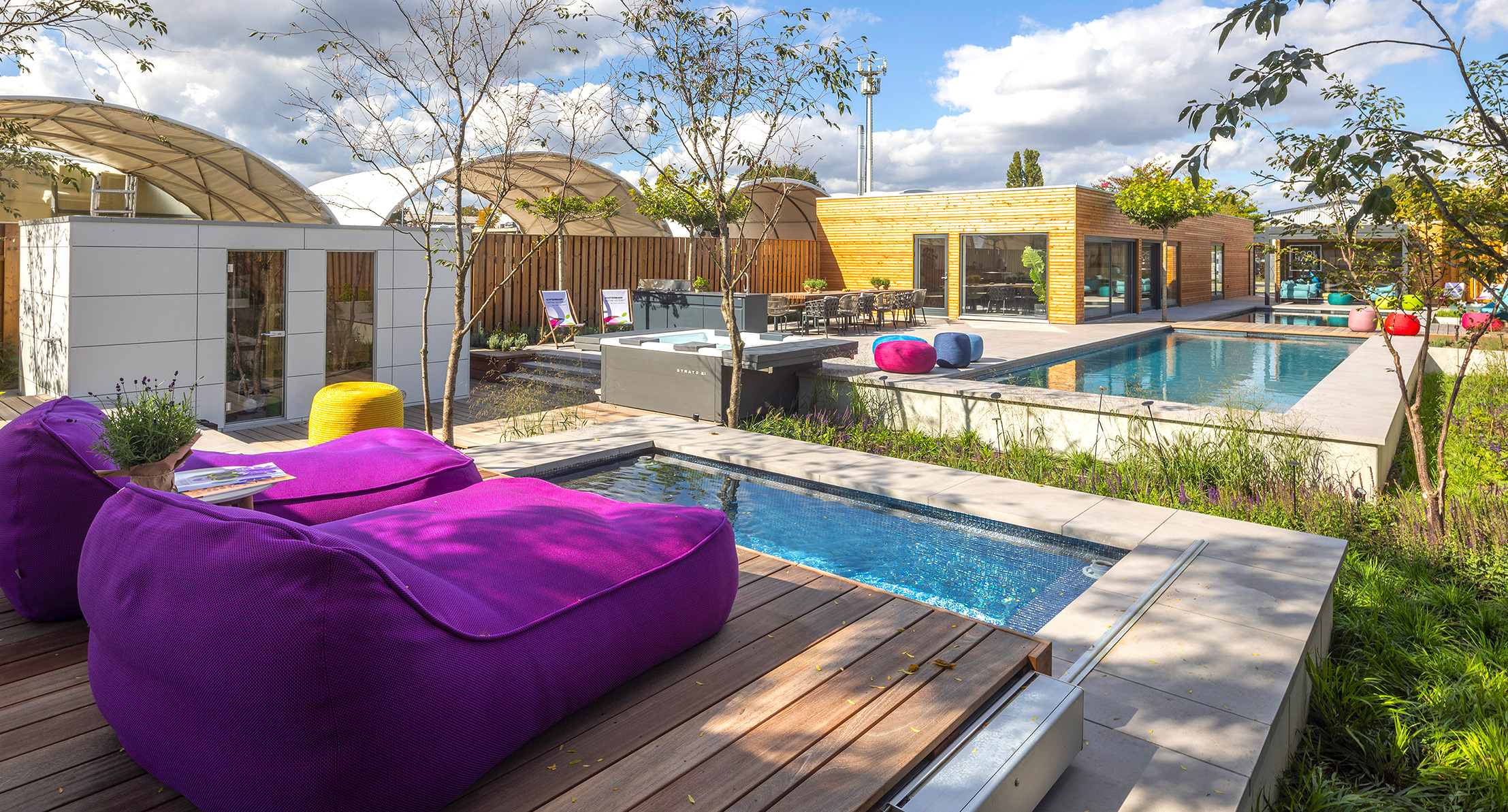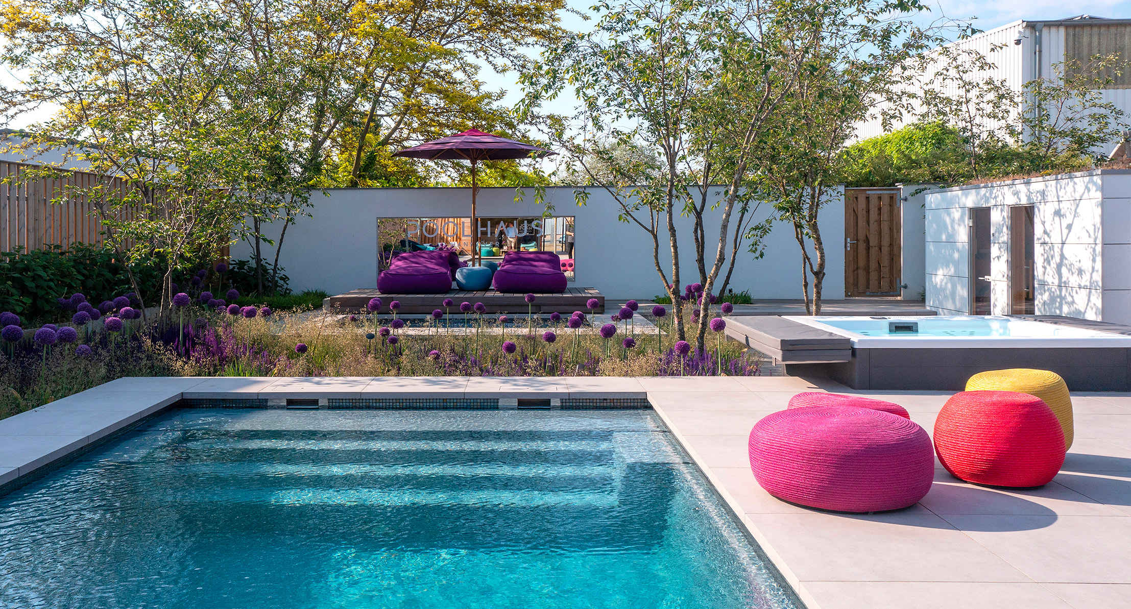 Established in 1992, GrünForm Achtermann is a youthful team specializing in gardening and landscaping, focusing on custom shading structures and swimming pools. In the summer of 2022, they expanded their outdoor exhibition space in Hanover, spanning over 2,400 square meters, with the addition of PoolHaus, a special project situated in the nearby town of Springe. PoolHaus is designed to offer visitors a welcoming and private green oasis. It features lush plants with delicate canopies and vibrant flowers, creating an enveloping atmosphere of peace and well-being.