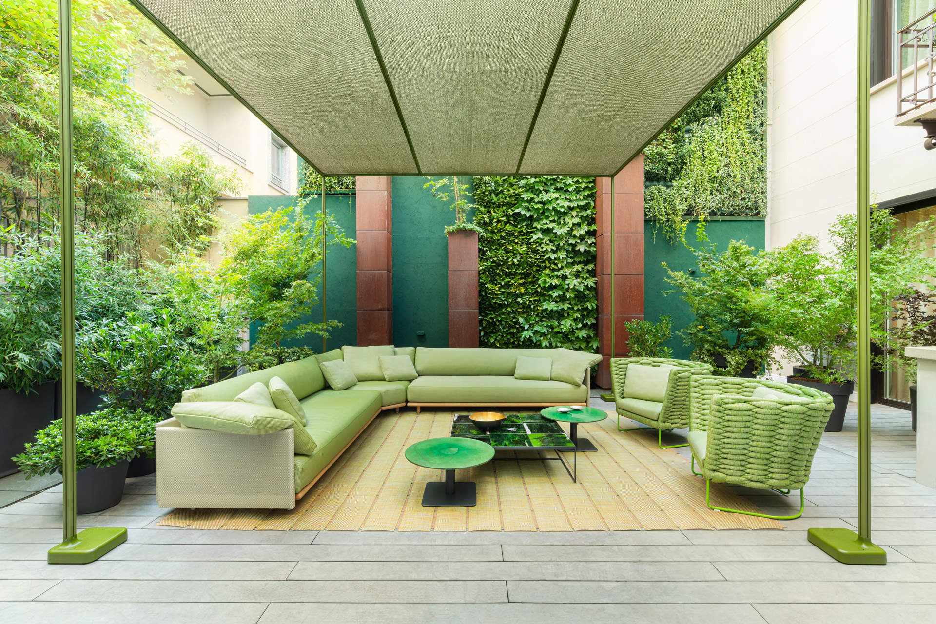 Giancarlo Morelli, Michelin-one star chef and owner of the Bulk restaurant and the Bulk Mixology Bar in Milan (via Aristotile Fioravanti 4) to furnish the exterior of his restaurant has chosen chairs, tables and sofas by Paola Lenti in different shades and materials, with a fairy-tale effect deliberately contrasting with the “male” sobriety of the interiors.