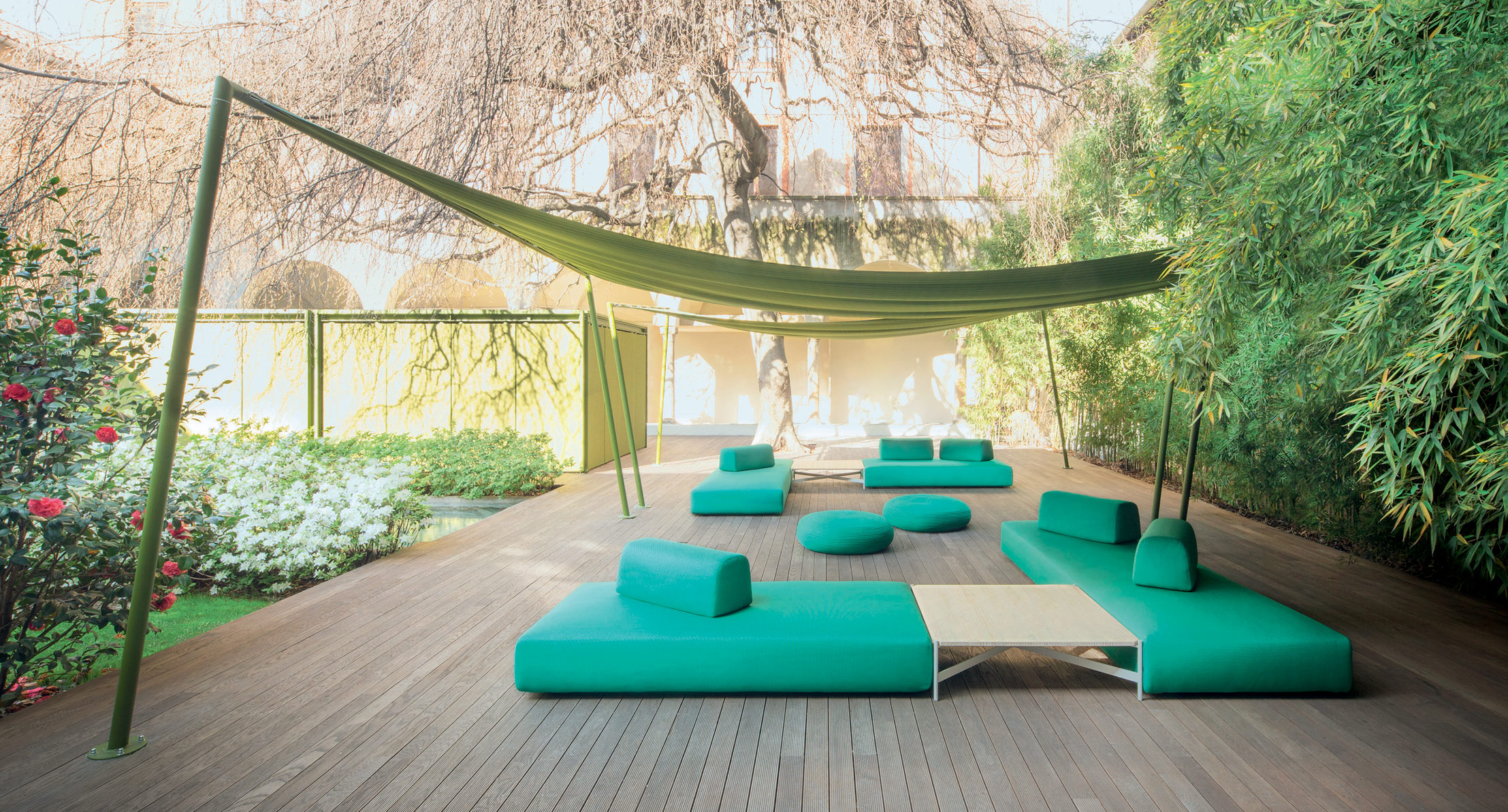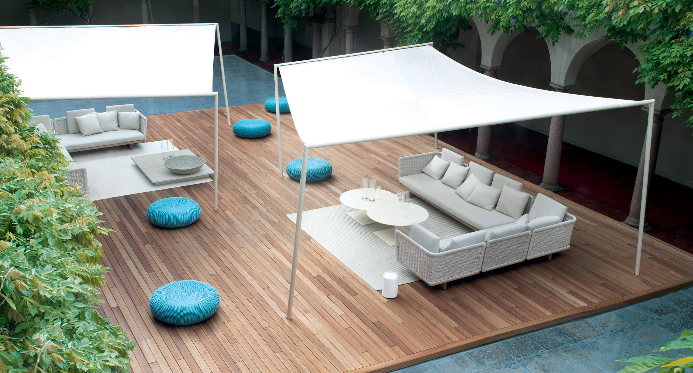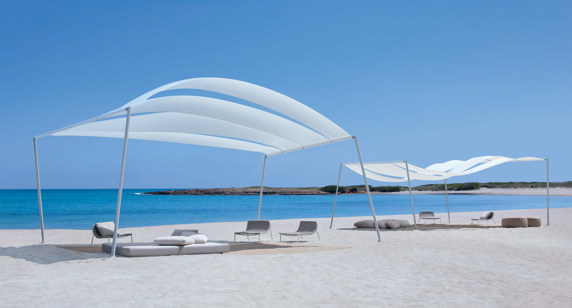 In the second case, the shading sail is one piece and it is hooked to the structure by means of steel snap hooks connecting it to a sliding mechanism made of a light alloy, which is placed inside the cross beams.