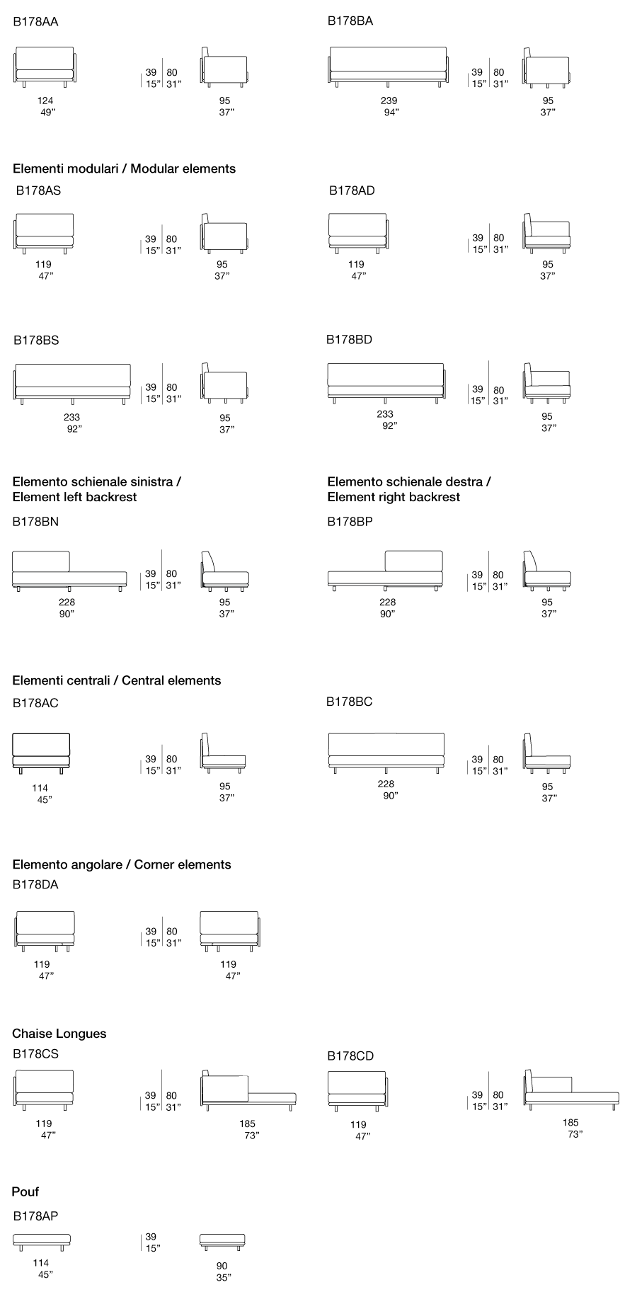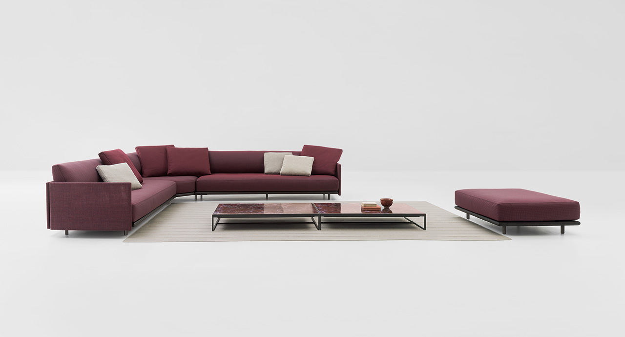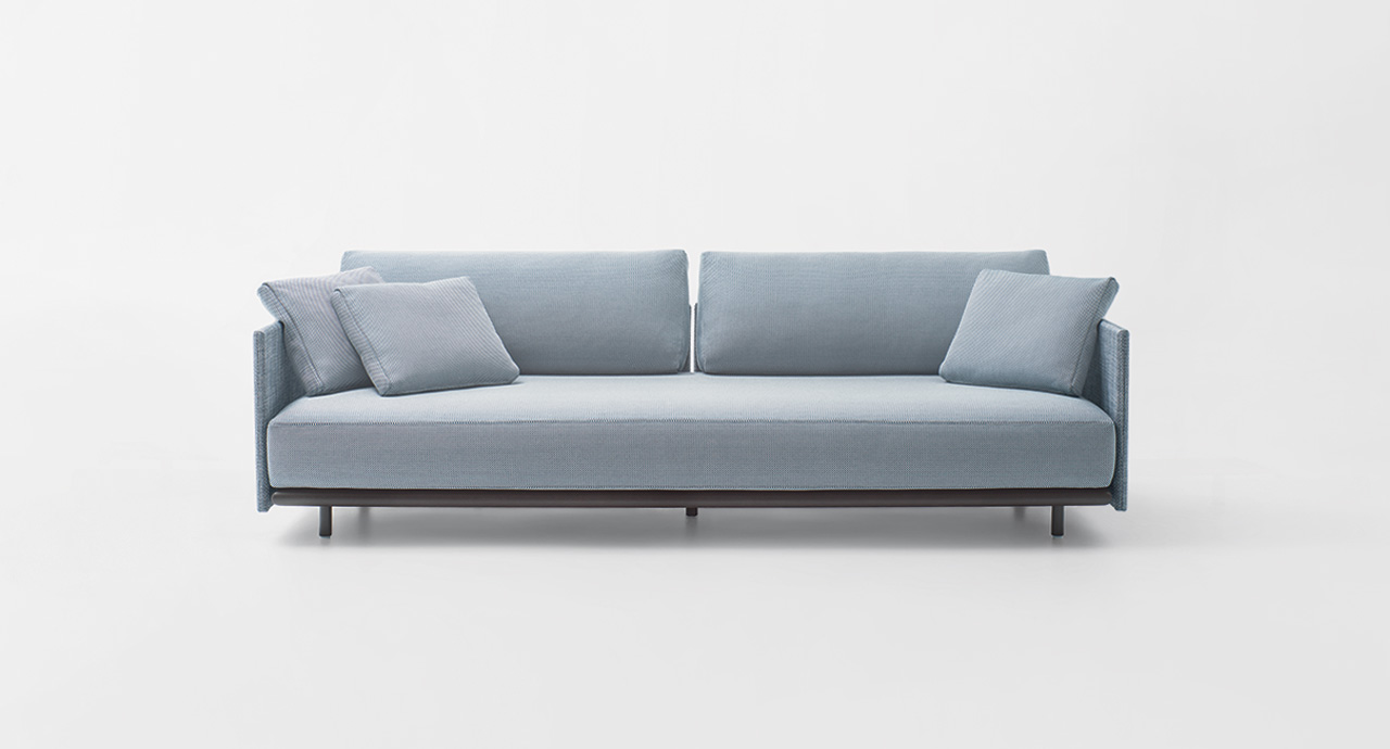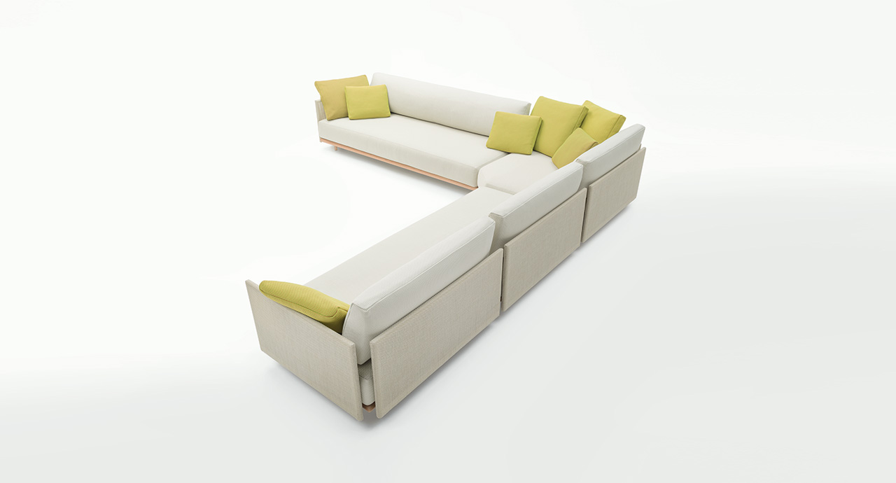 The Harbour series includes an armchair, a three-seater sofa, modular elements with right or left armrest, a central element, a chaise longue and a pouf.