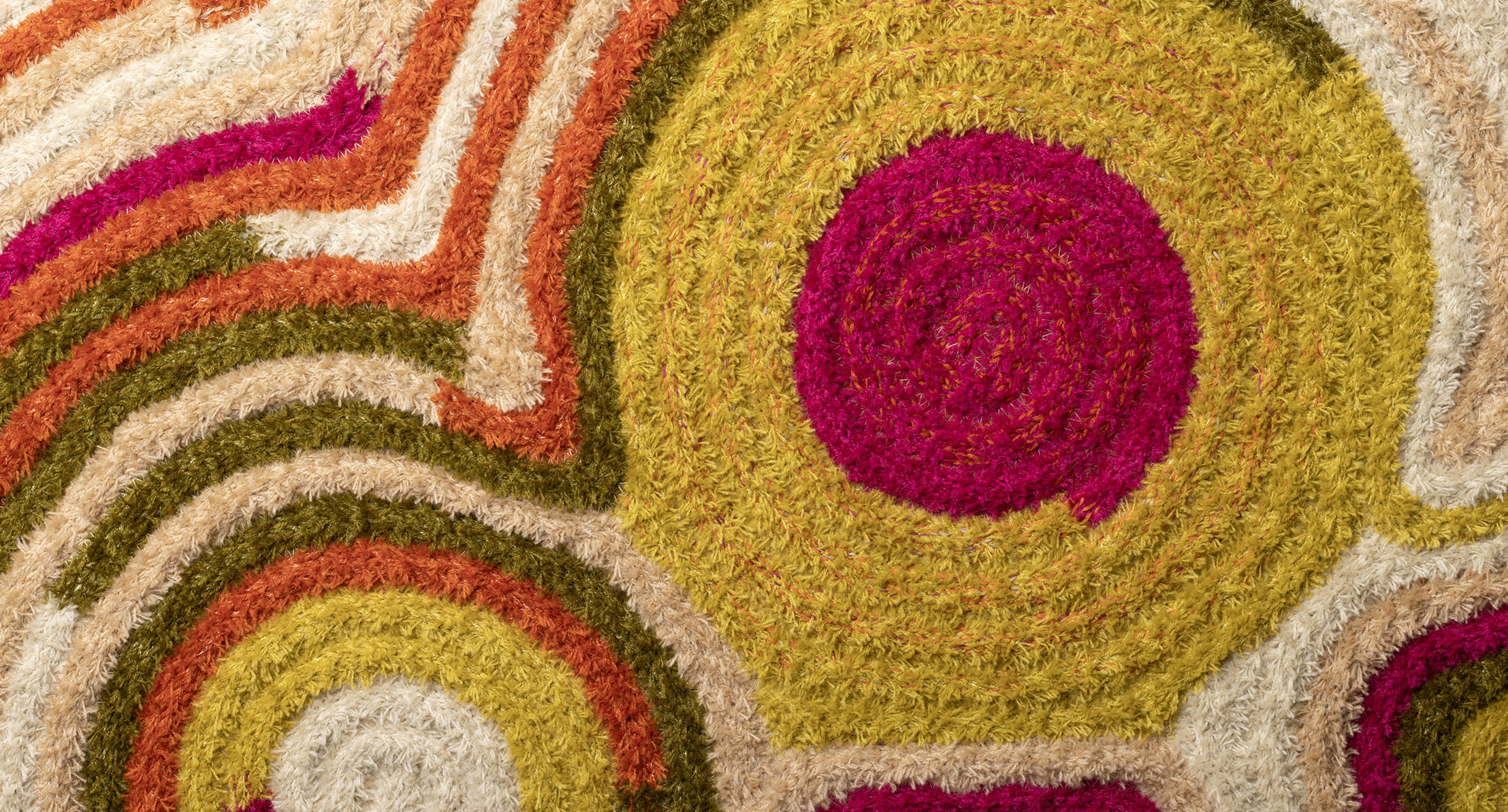 This rug is created with a tubular knit with a soft, “shaggy” appearance, and a deliberately irregular texture sewn with Punto Zigzag (Corda Ruffle).
