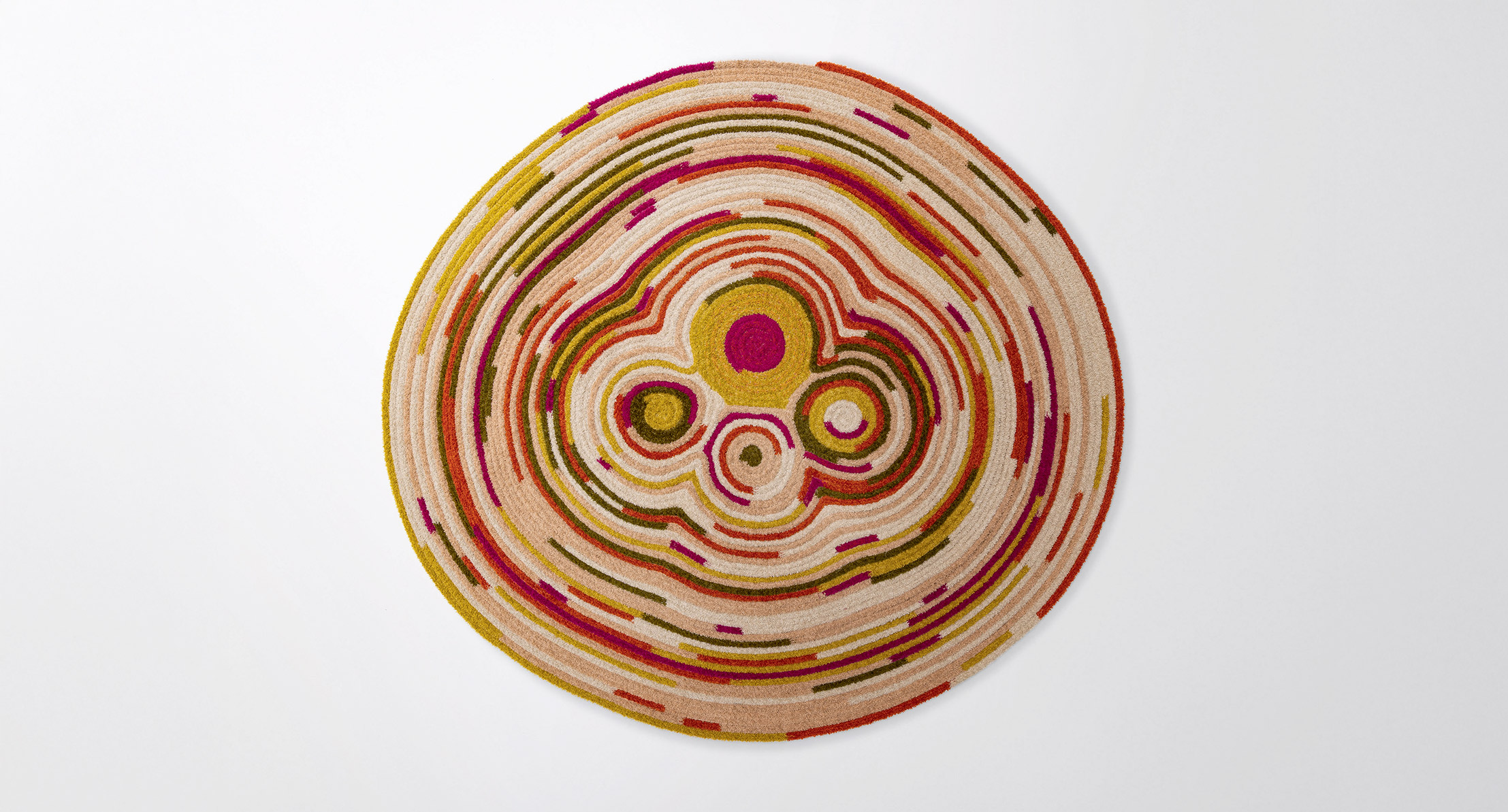 The centre of the rug consists of a set of four well-defined circular shapes of different sizes and colours.
