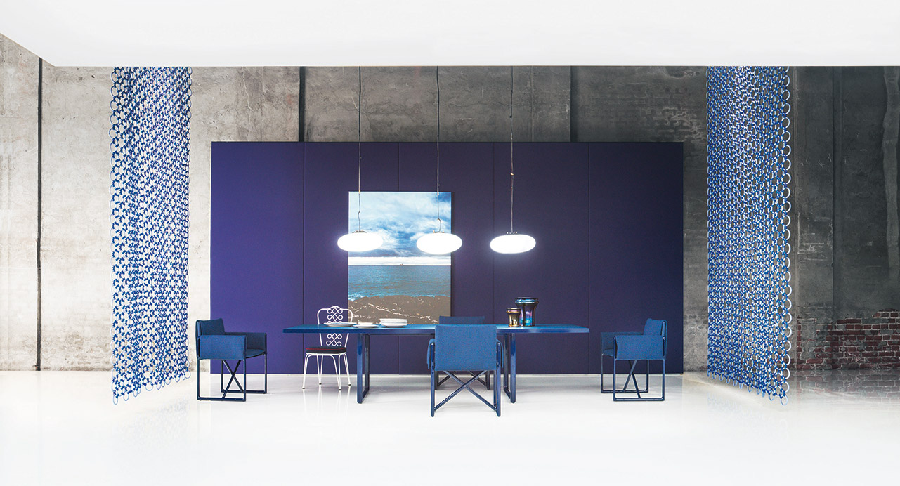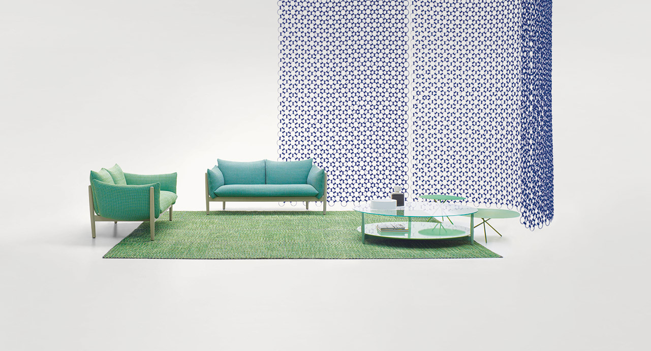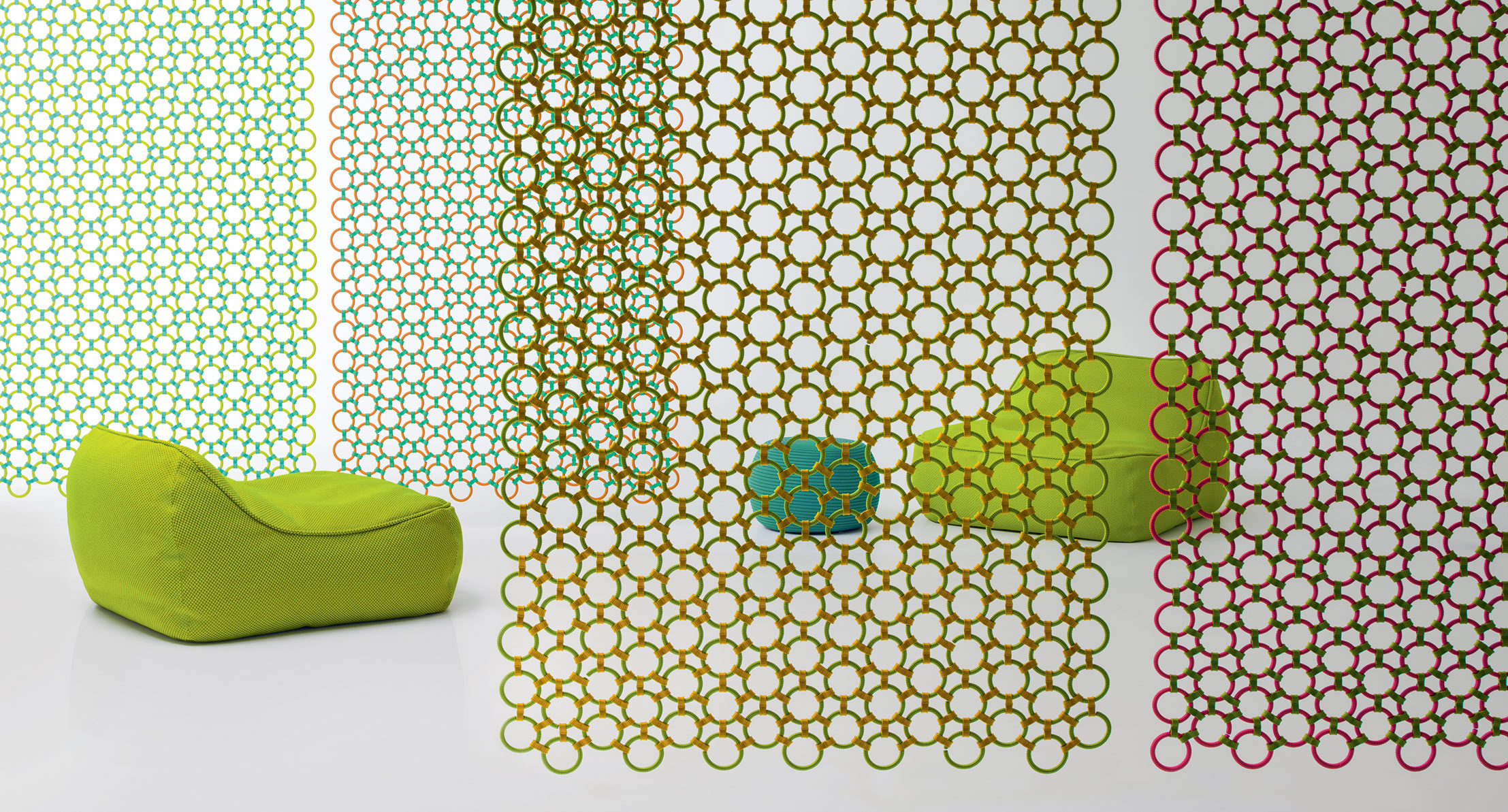 Mandala backdrops are made of Rope cord, a Paola Lenti signature material, which is used to weave by hand many outdoor seating pieces and to produce the rugs in the High Tech collection.