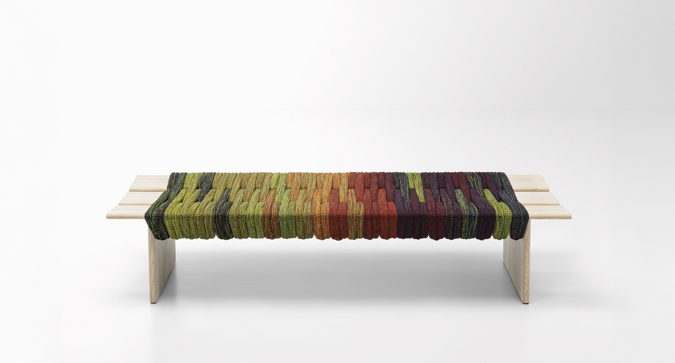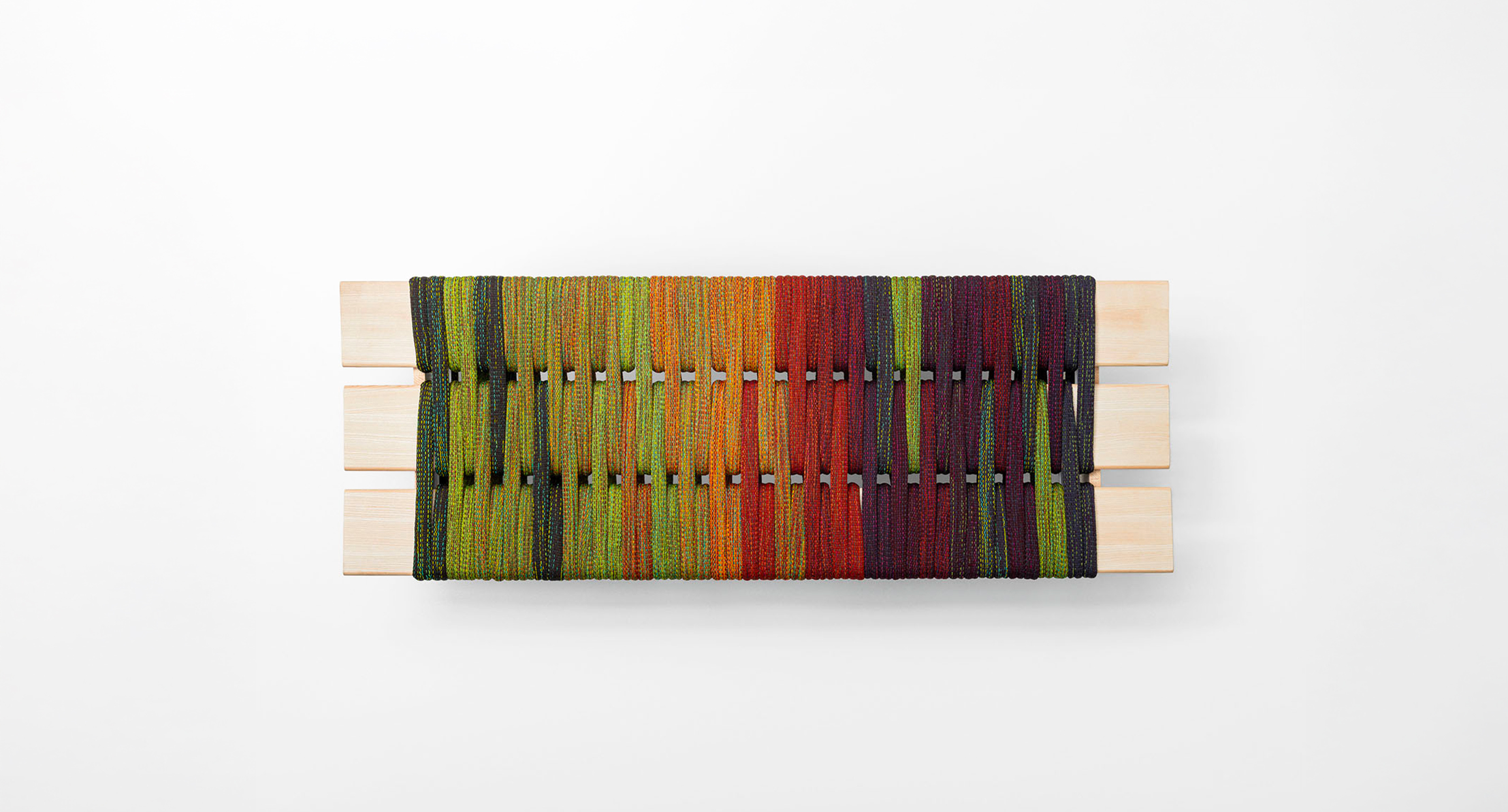 The rings are fitted onto the ash wood structure according to a predefined colour sequence and combination.