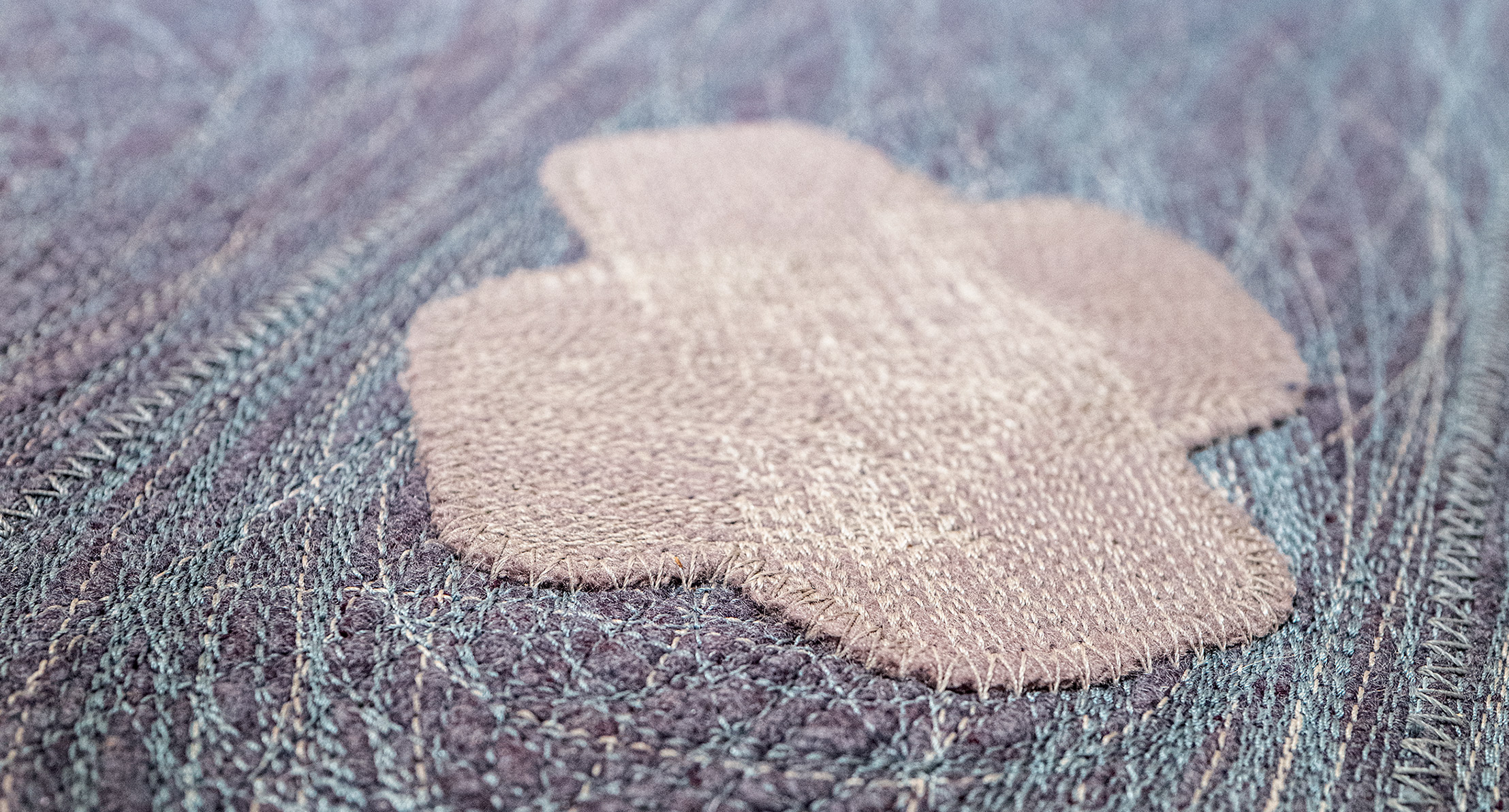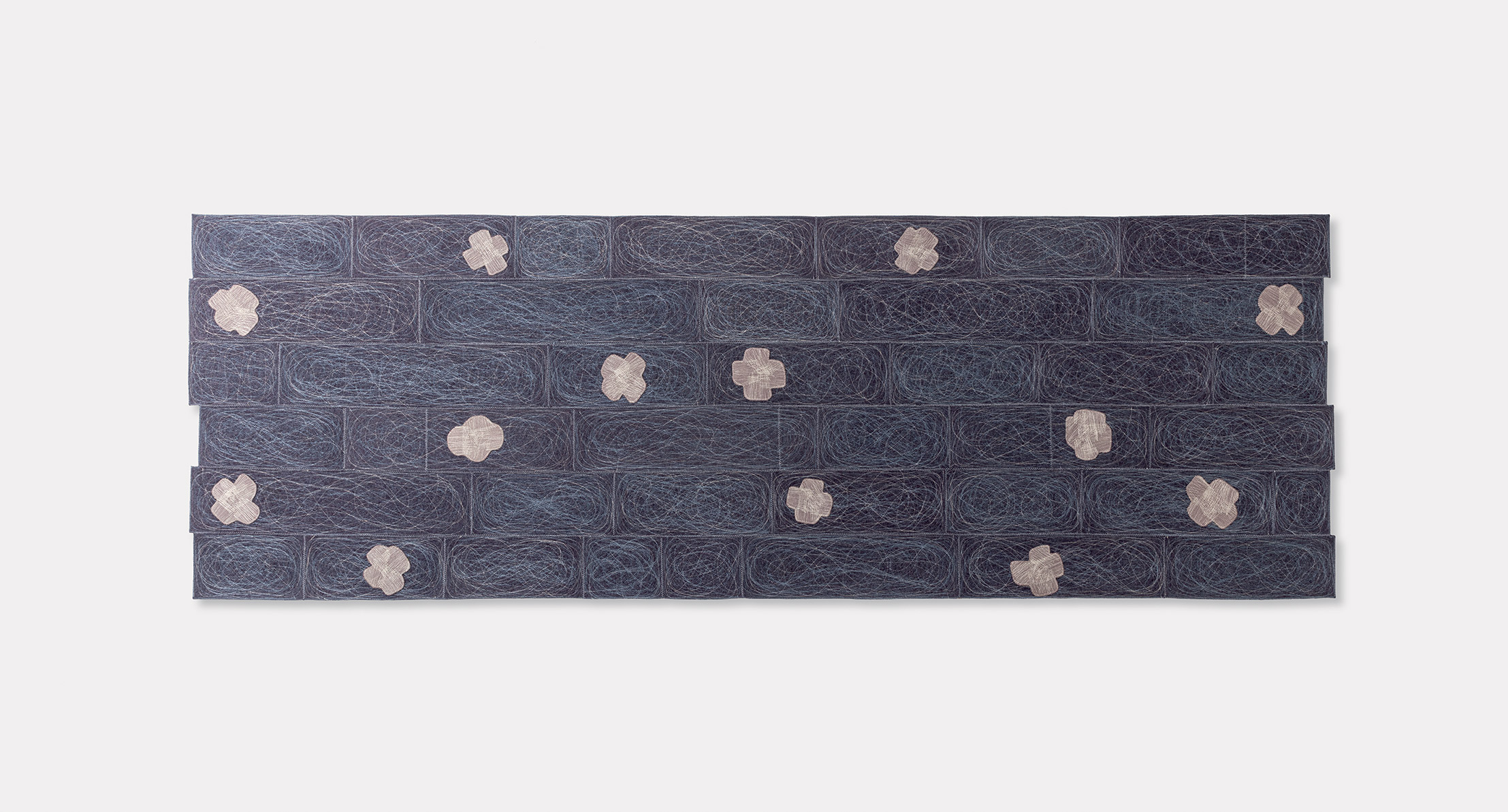 Felt decorations recalling clouds, are equally machine-embroidered with a thread in one colour only and then sewn with Punto Zigzag on the elements composing the rug’s surface.