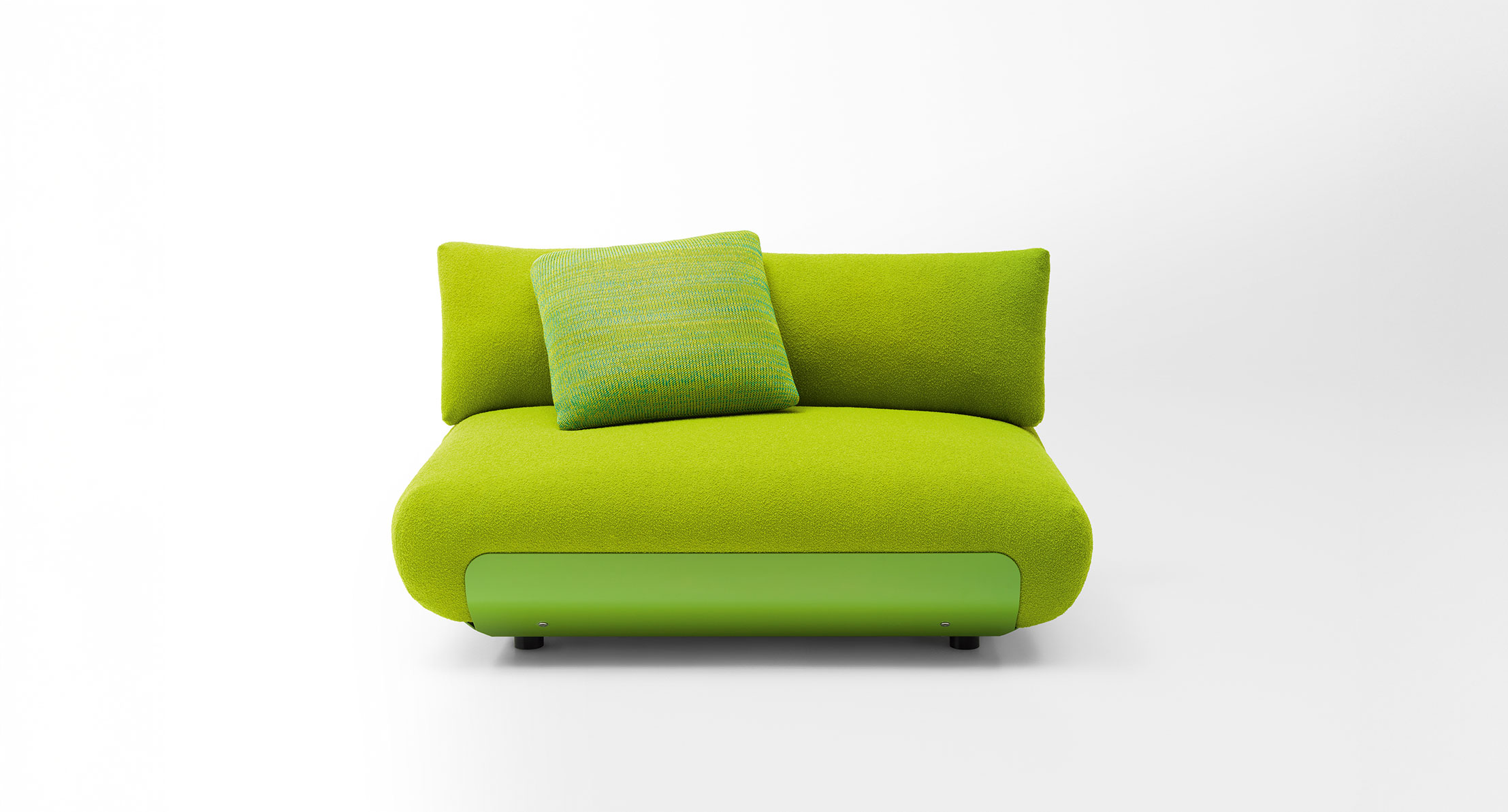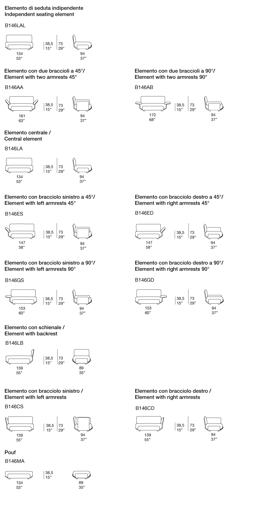 Series composed of armchair, central element, end elements with armrest and pouf.