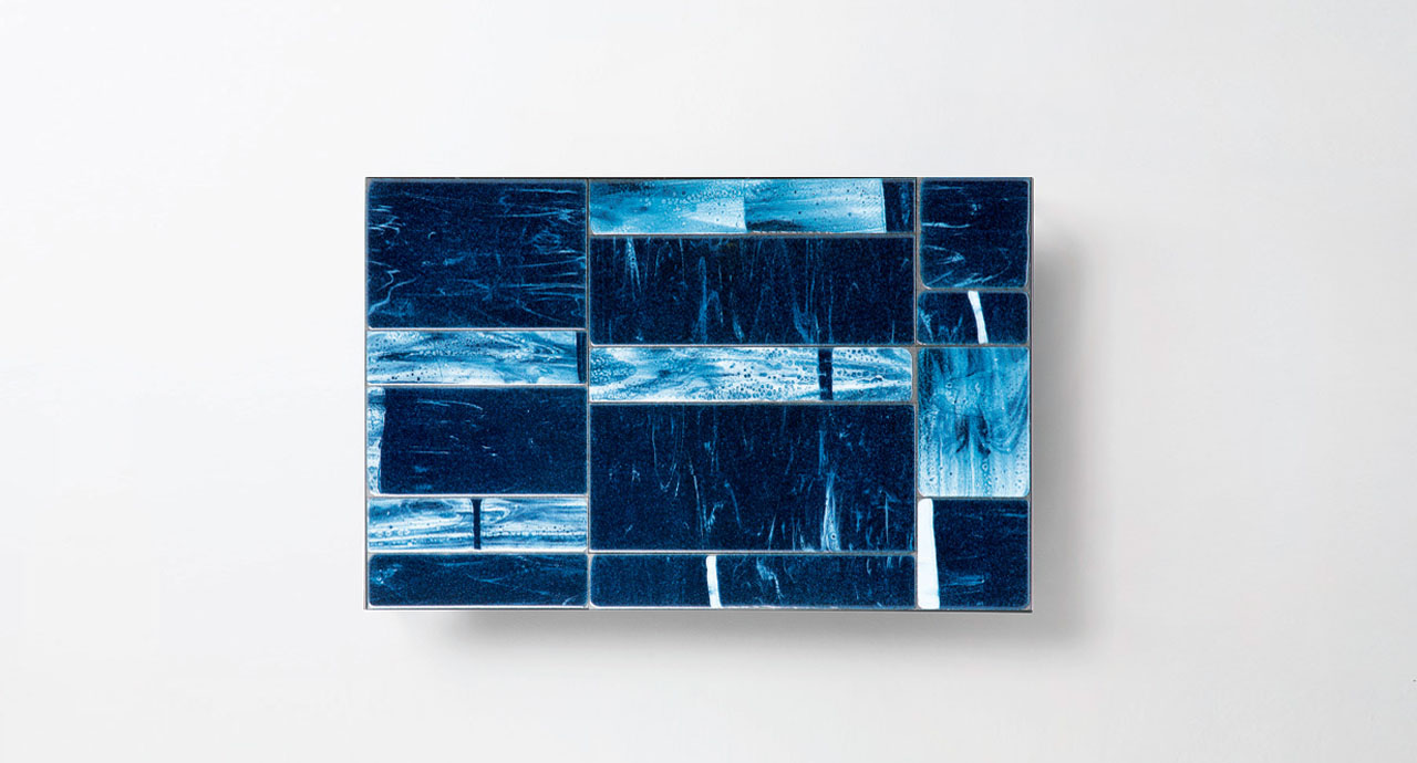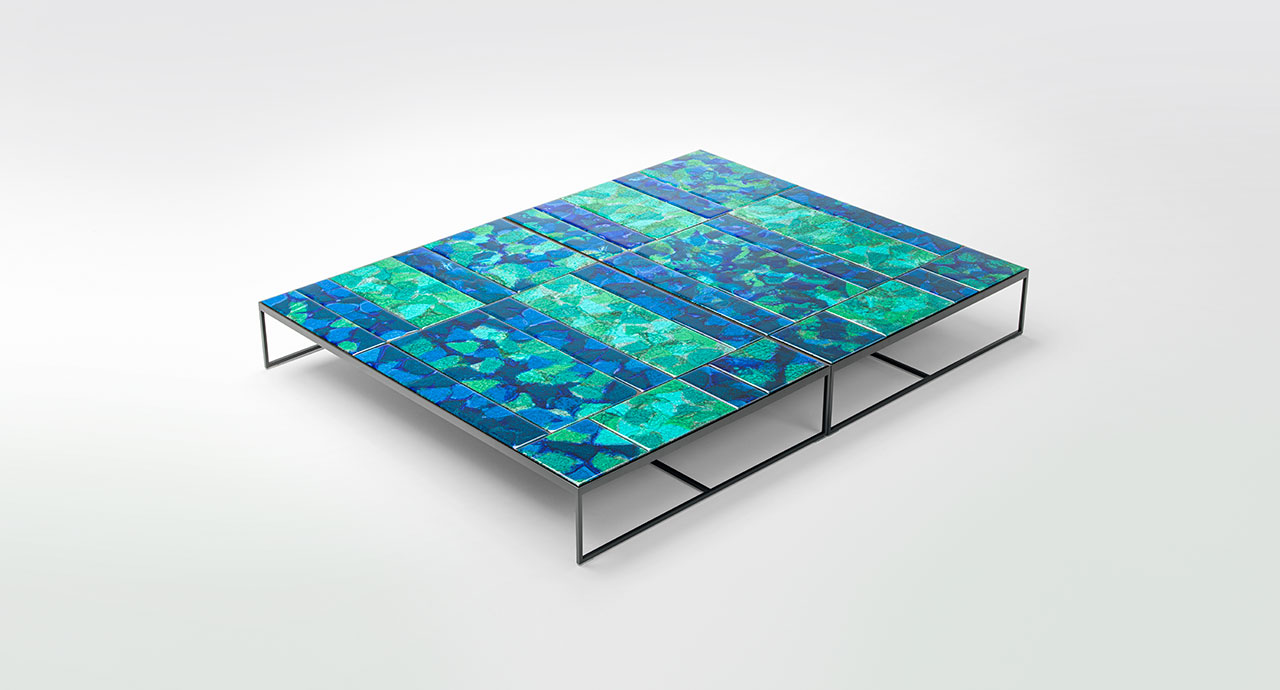The top décor is made by hand and makes each single piece unique. The material, the particular production process and technique lead to different patterns on each element, which in turn form tops, which are different from one another, even within the same batch. Irregularity is the featuring characteristics of this production process.