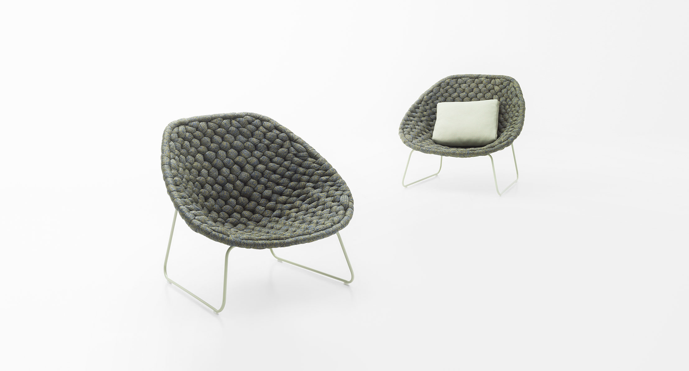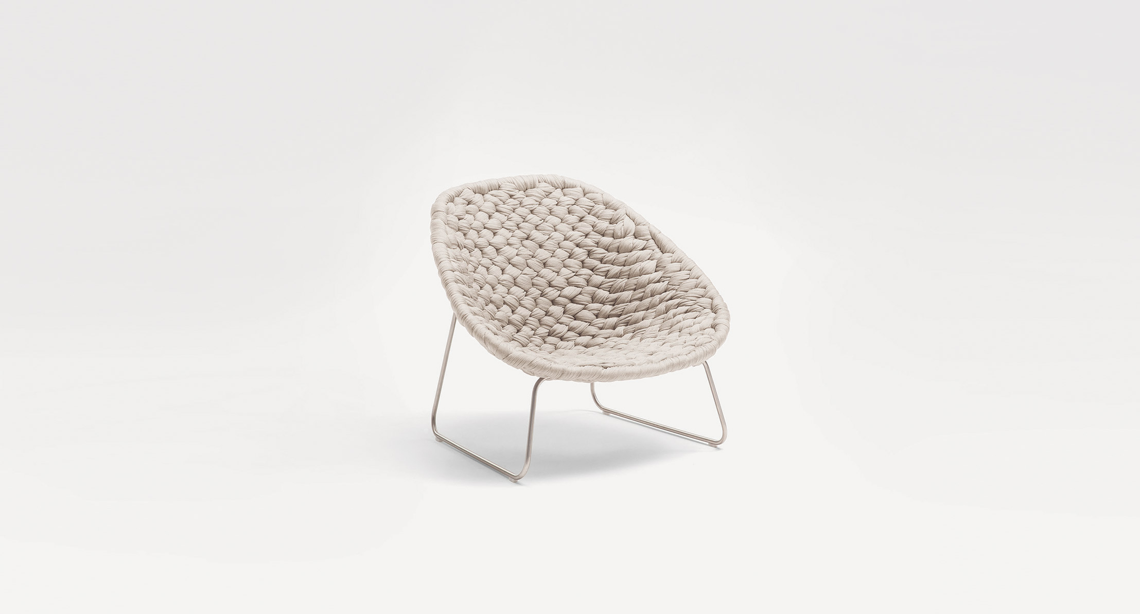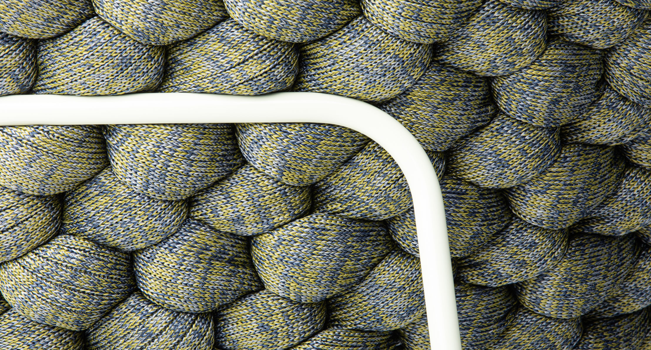 Structure upholstery: weave in Chain Outdoor tubular knit, padding in recycled and biodegradable polyester fibre.