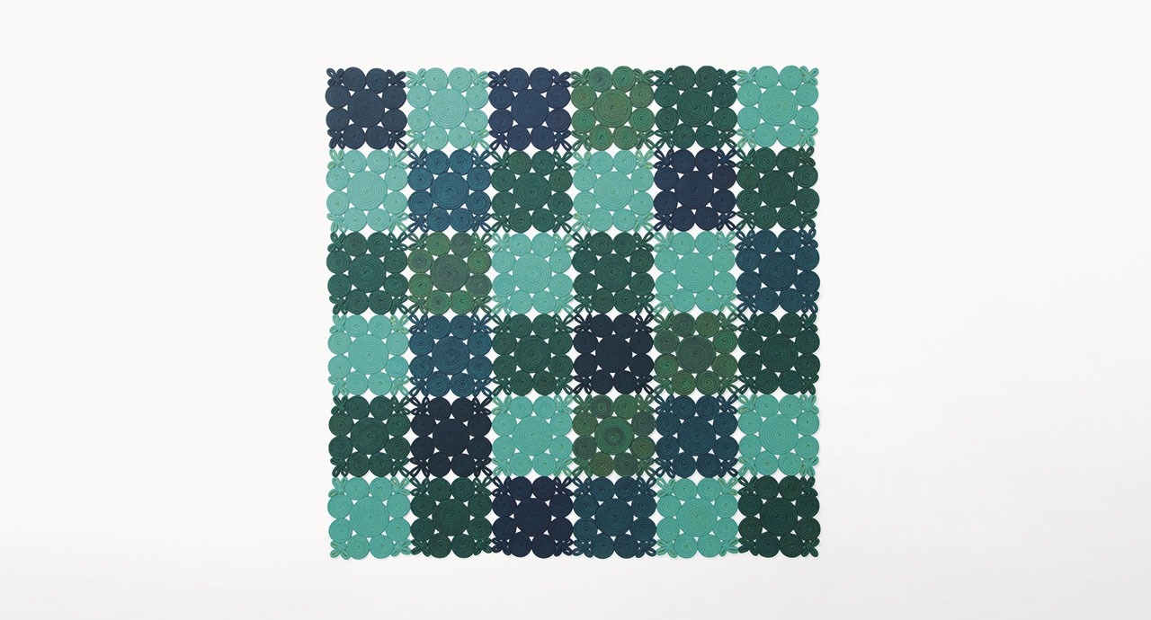 Spin is a modular rug created by joining elements made of a mélange colour wool cord.