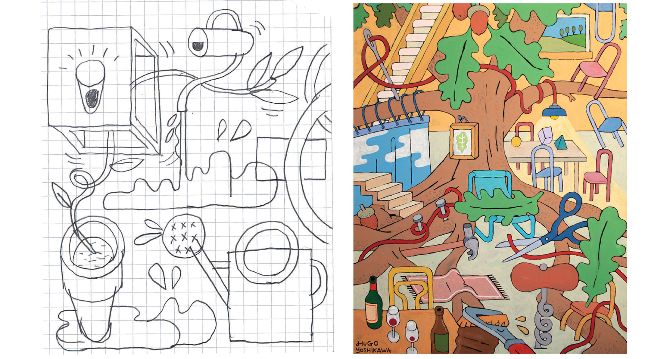 Cresciuto tra Parigi, Tokyo, Bangkok e New York, diplomato a Londra al Camberwell College of Arts, Yoshikawa trae ispirazione per le sue opere dalla natura, trasferendo la meraviglia del mondo vegetale all’universo domestico: nelle sue tavole illustrate, alberi e piante si “insinuano” tra le mura di casa per mettere radici tra sedute, tavoli e tappeti, mentre fiori e foglie si confondono con gli oggetti d’uso quotidiano. Il risultato è un’idea di casa dai tratti fantastici, in cui il dentro si fonde con il fuori e viceversa.
