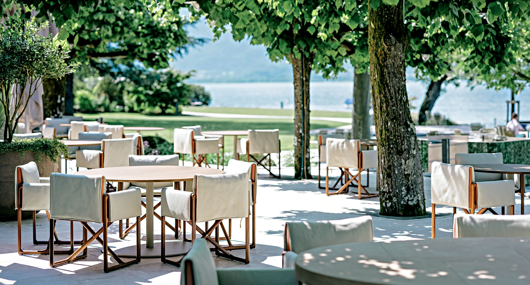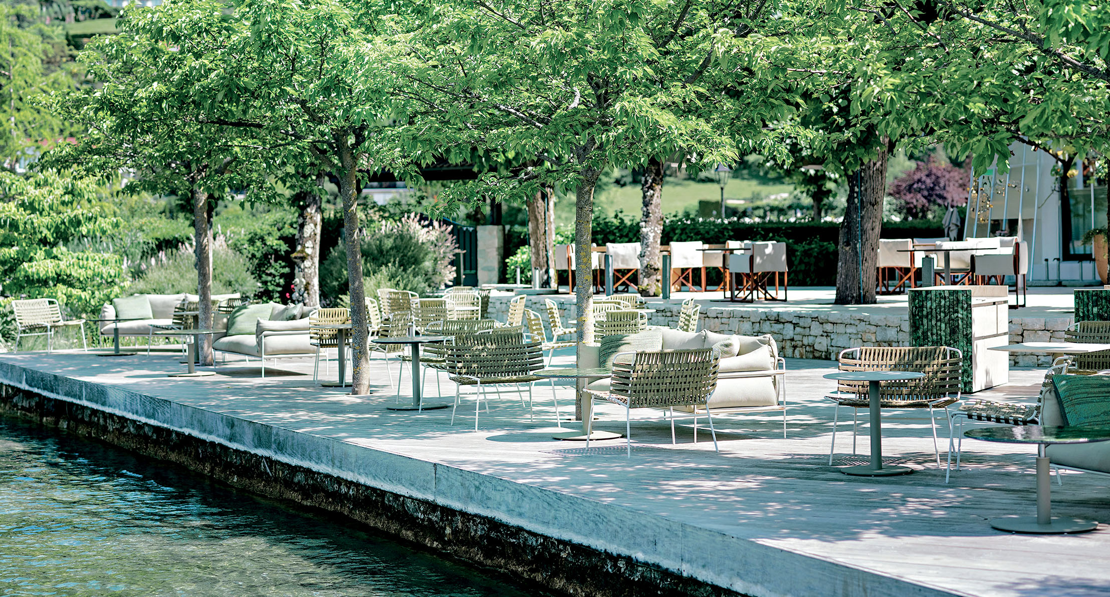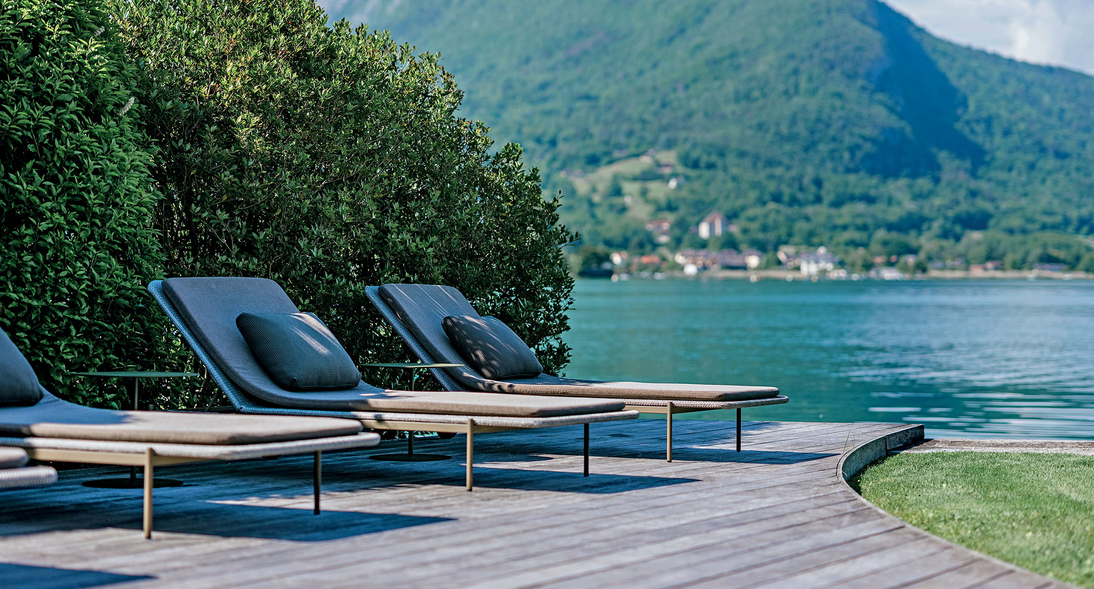 All’interno dell’Auberge du Père Bise i prodotti Paola Lenti definiscono funzione e identità di tre aree: la terrazza alta, elegante ed esclusiva, che ospita il ristorante e una lounge; una terrazza leggermente più bassa, a livello del lago, dall’atmosfera distesa e rilassante; e, infine, il solarium, riparato dagli sguardi.