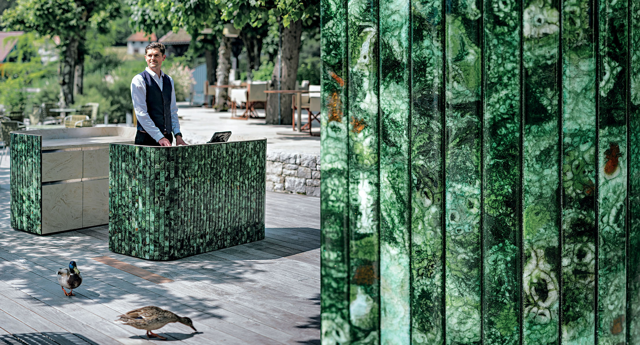 Disegni esclusivi, pezzi unici, mescolanze di colori che richiamano l’esatto punto di contatto cromatico con le nuance dell’acqua del lago, delle montagne e della vegetazione intorno: il progetto per l’Auberge du Père Bise esprime l’innata e consolidata capacità dell’azienda di sviluppare progetti ad un livello altissimo di sartorialità.