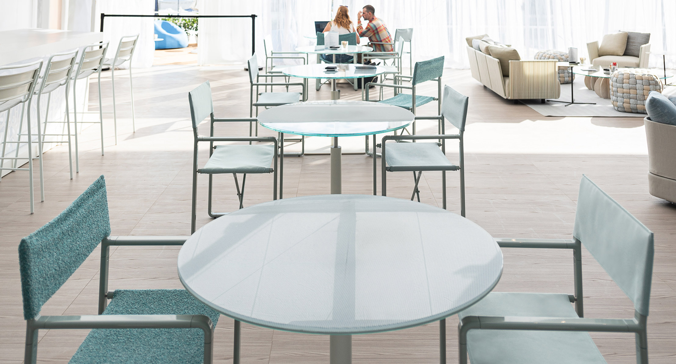 Il risultato del sodalizio creativo fra designer ed azienda è una serie speciale di sedute progettate per lo yachting: una poltroncina da tavolo imbottita e dalle dimensioni generose; una sedia e una sdraio in alluminio e acciaio, pieghevoli e facili da riporre; una piattaforma circolare dotata di due schienali e un tavolino che ruotano intorno alla struttura per consentire bagni di sole a tutto tondo. I colori e i tessuti di rivestimento sono quelli esclusivi delle collezioni Paola Lenti.
