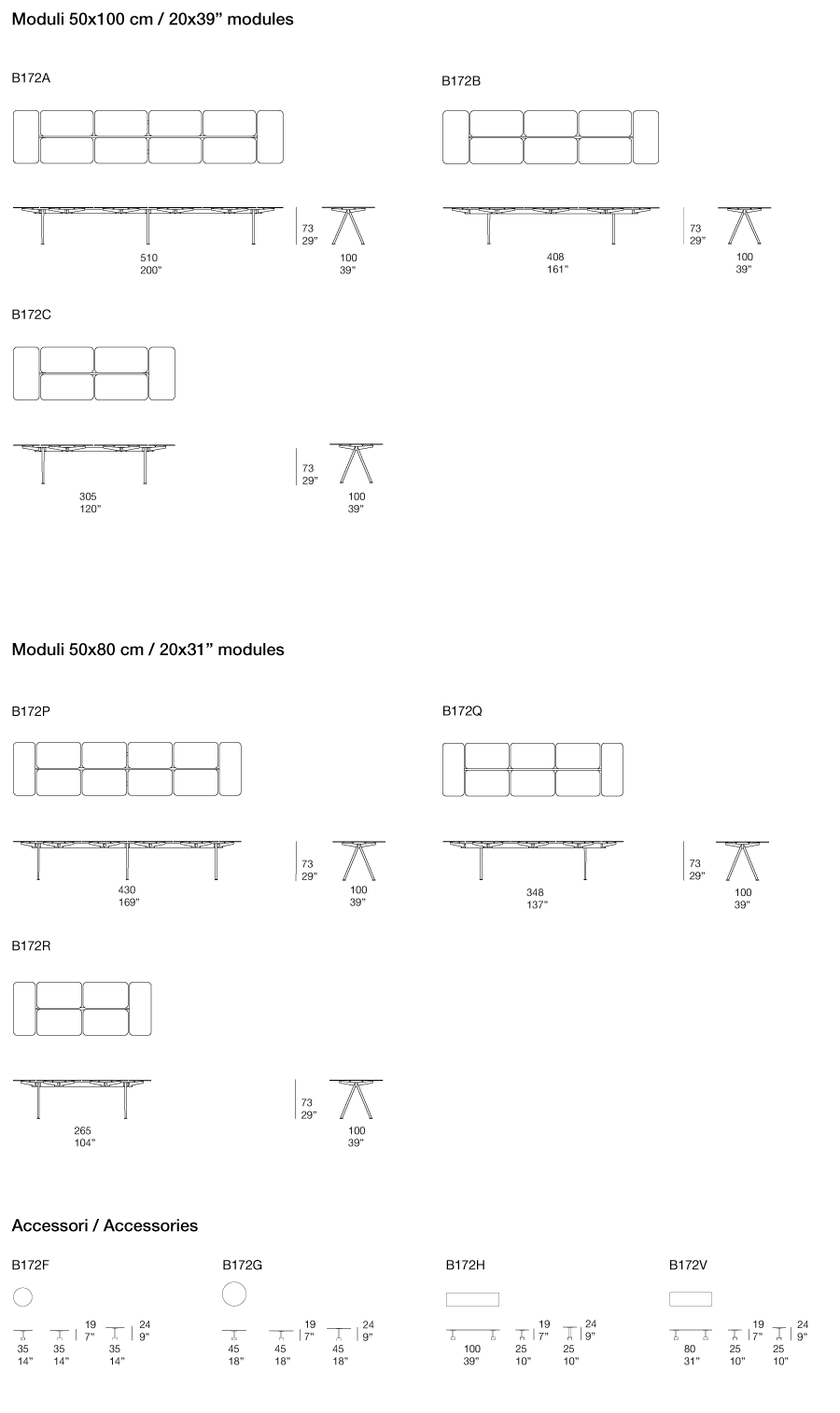 I piani accessori sono disponibili in due altezze (cm 19 e cm 24) e scorrono lungo la barra centrale che collega le basi del tavolo per poter essere fissati nella posizione desiderata. I piani codice B172F e B172G sono girevoli.