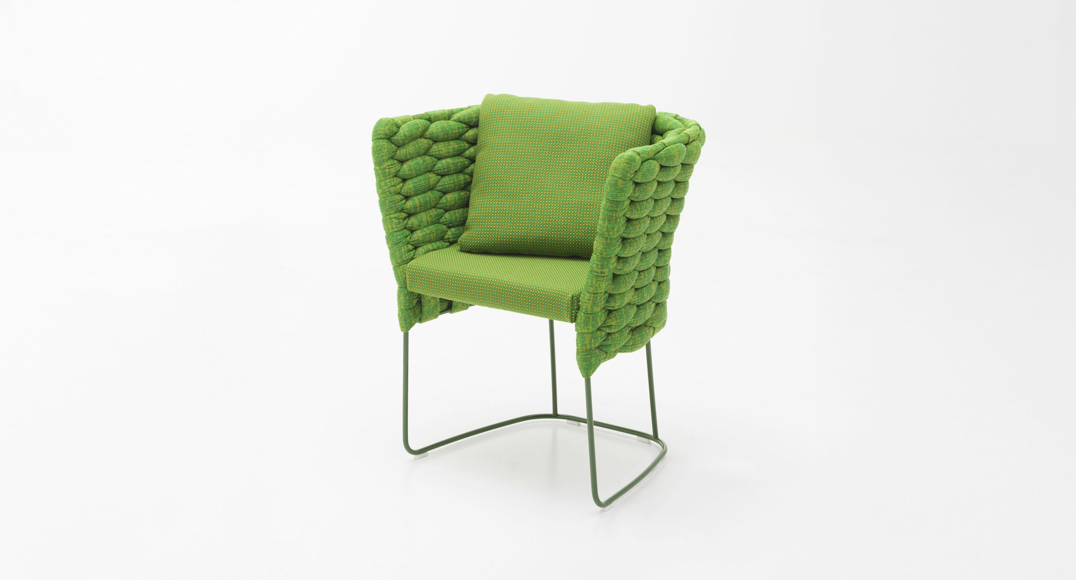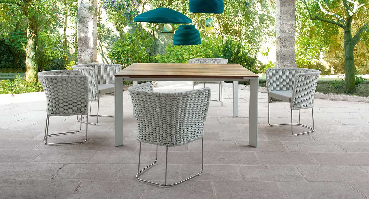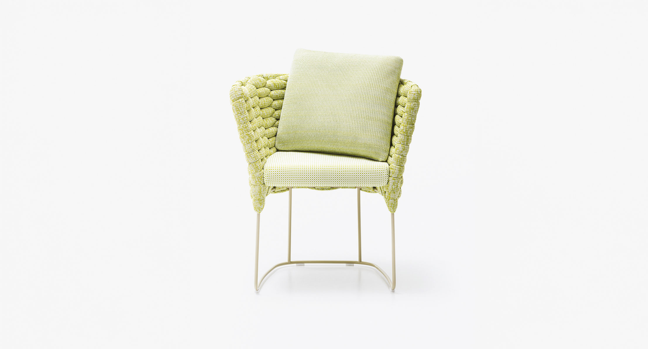 Rivestimento del cuscino di seduta: fisso, disponibile nei tessuti outdoor indicati qui sotto in abbinamento all’intreccio della struttura.