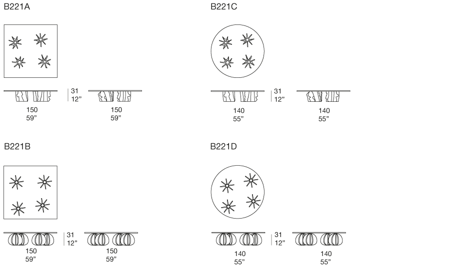 Gli elementi che formano la base dei tavolini Astri sono disponibili in due forme diverse: possono essere più cilindrici e avere i bordi irregolari e frastagliati (tavolini codice B221A e B221C), oppure essere più arrotondati e avere i bordi più lisci (tavolini codice B221B e B221D). Sono previsti quattro elementi per ciascun tavolino: in nessun caso le due forme possono essere mischiate fra loro.