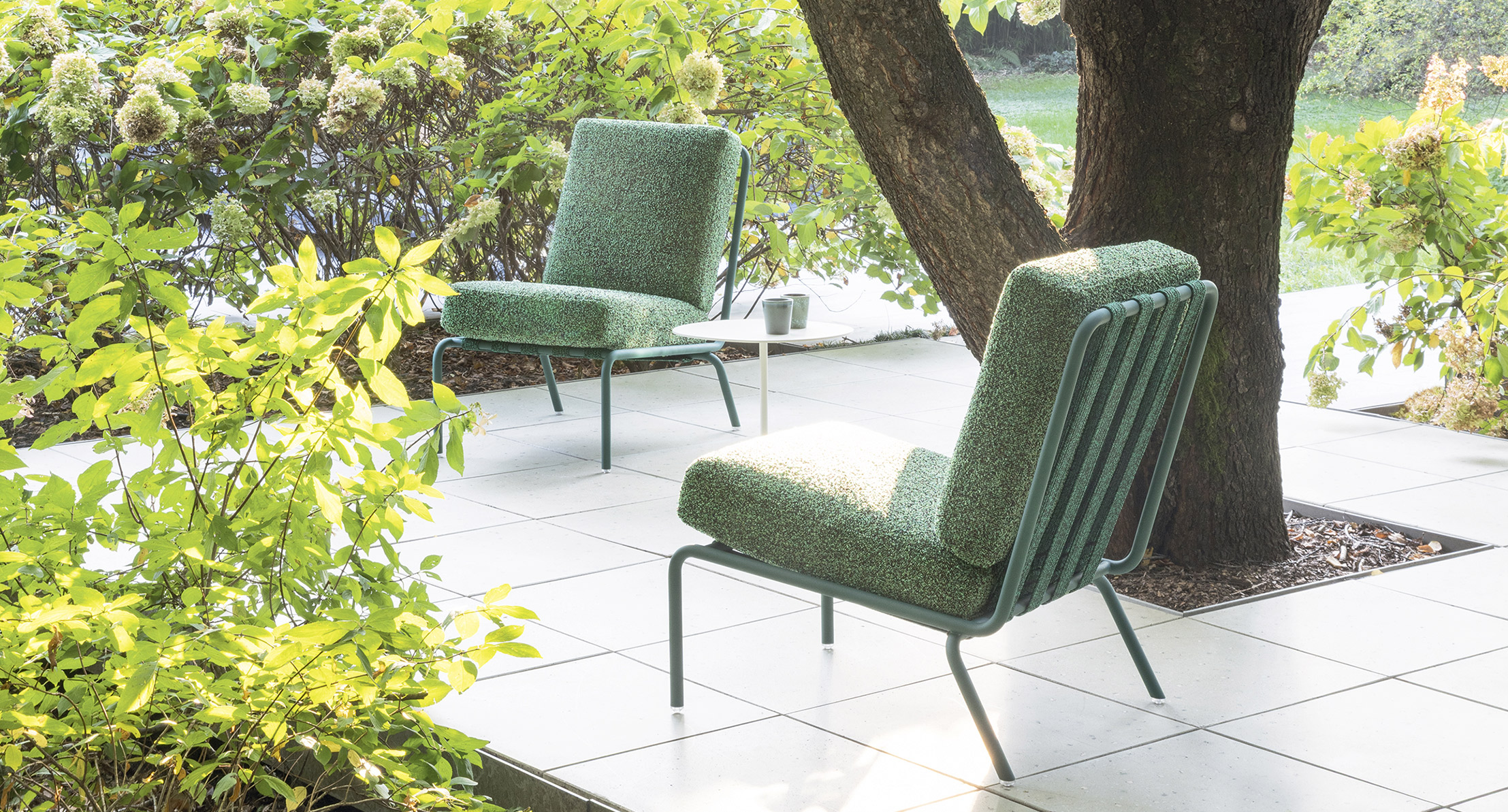Imbottitura dei cuscini di seduta e di schienale: fibra di poliestere riciclata e biodegradabile, inserto in poliuretano espanso indeformabile, fodera interna fissa in poliestere idrorepellente.
