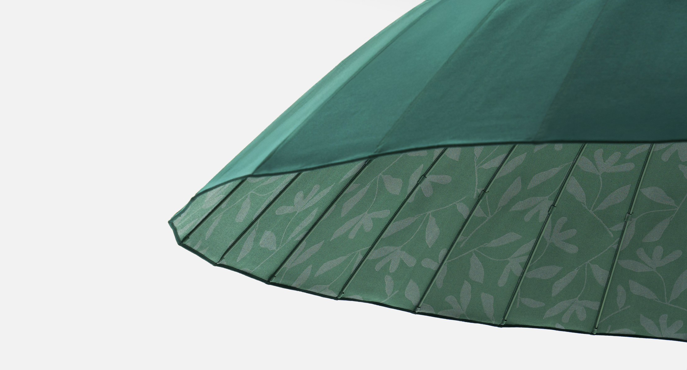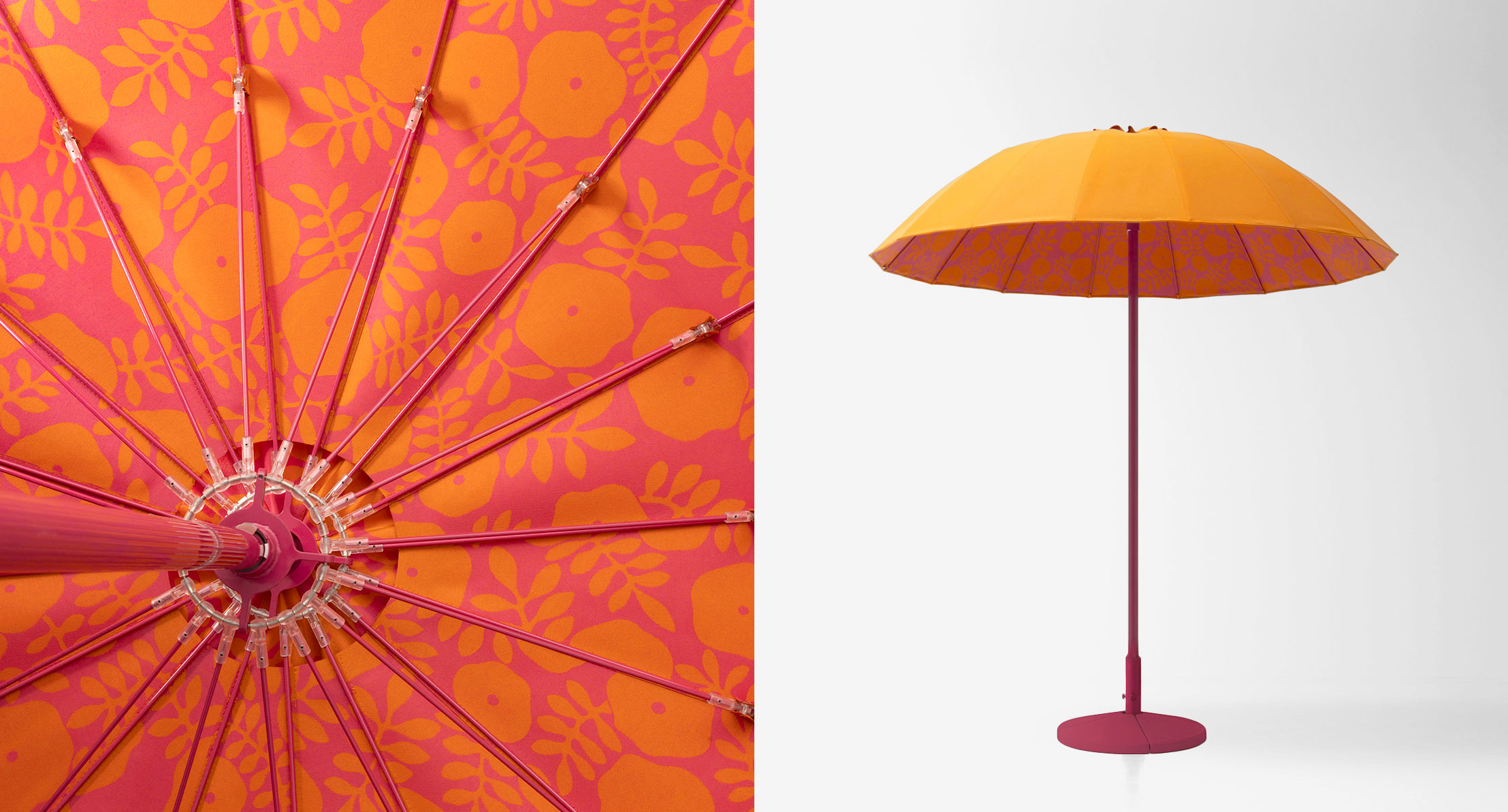 Schermo ombreggiante: in Poppy o Herbier, nuovi tessuti double-face in poliestere che vengono utilizzati lasciando il lato in tinta unita rivolto verso l’esterno e il lato disegnato a grandi fiori stilizzati (Poppy) o con profili di rami e foglie (Herbier) verso l’interno dello schermo ombreggiante.