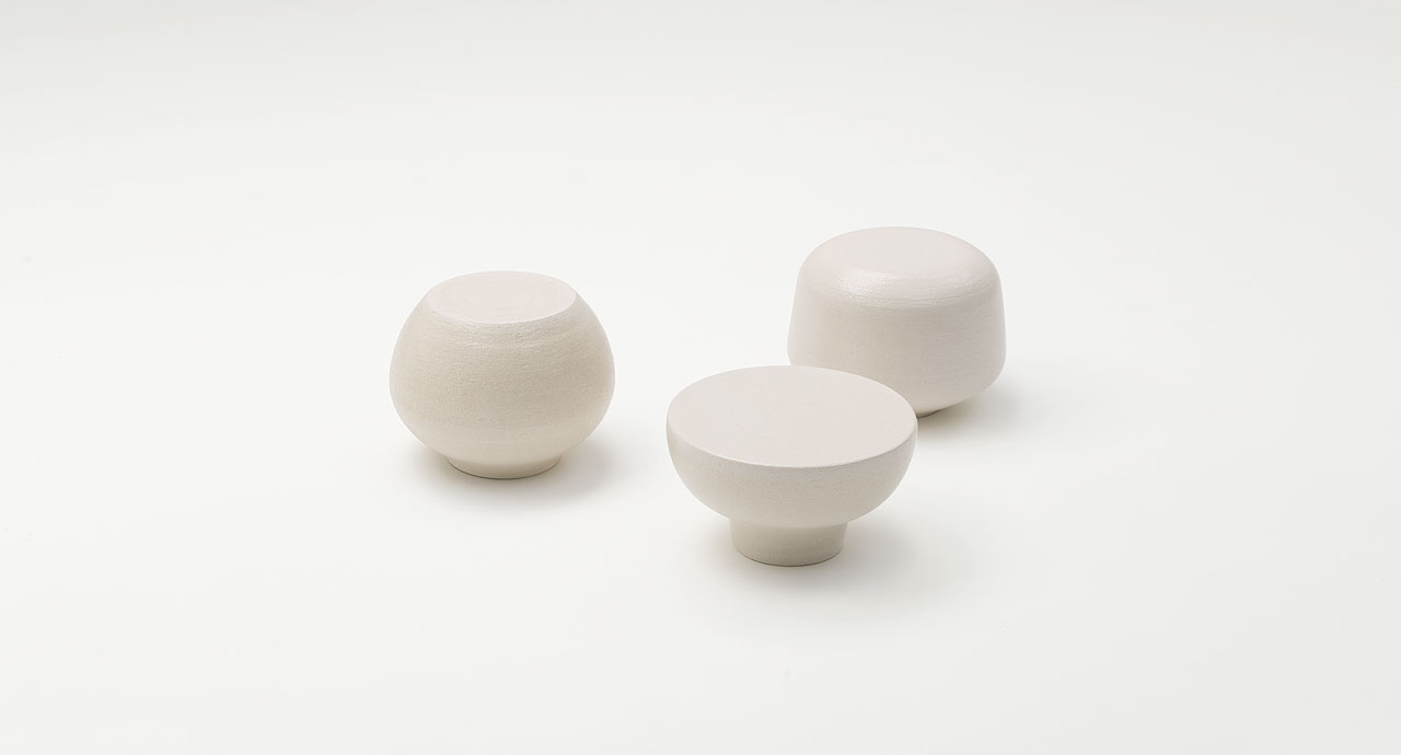 Serie di tavolini con forme e dimensioni diverse, decorati in bianco tono su tono o a colori.