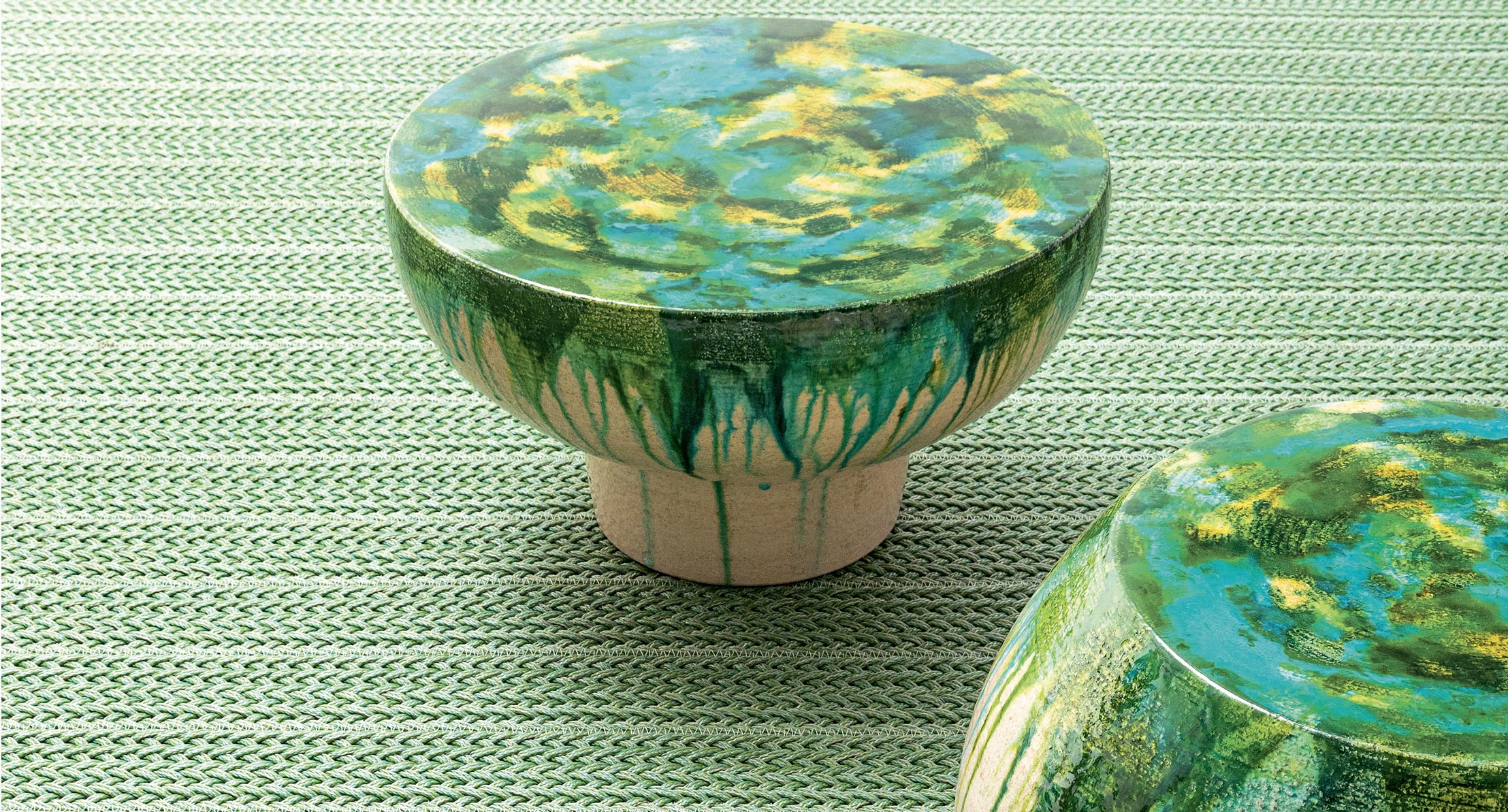 Il materiale, il particolare tipo di lavorazione e la tecnica usata per la produzione dei Calatini creano differenze di colore e di disegno fra tavolini anche della stessa partita e della stessa tipologia. L’irregolarità (anche nella versione in bianco tono su tono, dove sono possibili leggerissime ombre di colore) e l’unicità di ciascun pezzo sono caratteristiche volute e sono qualità distintive di questo prodotto.