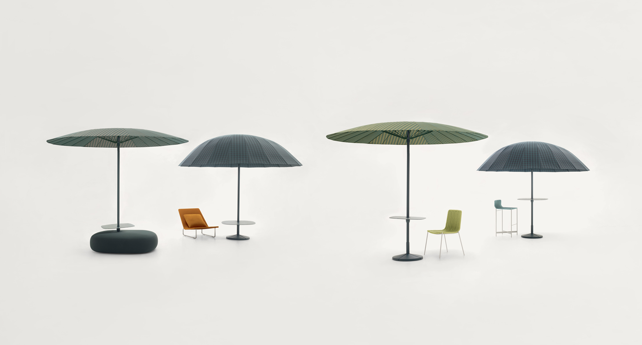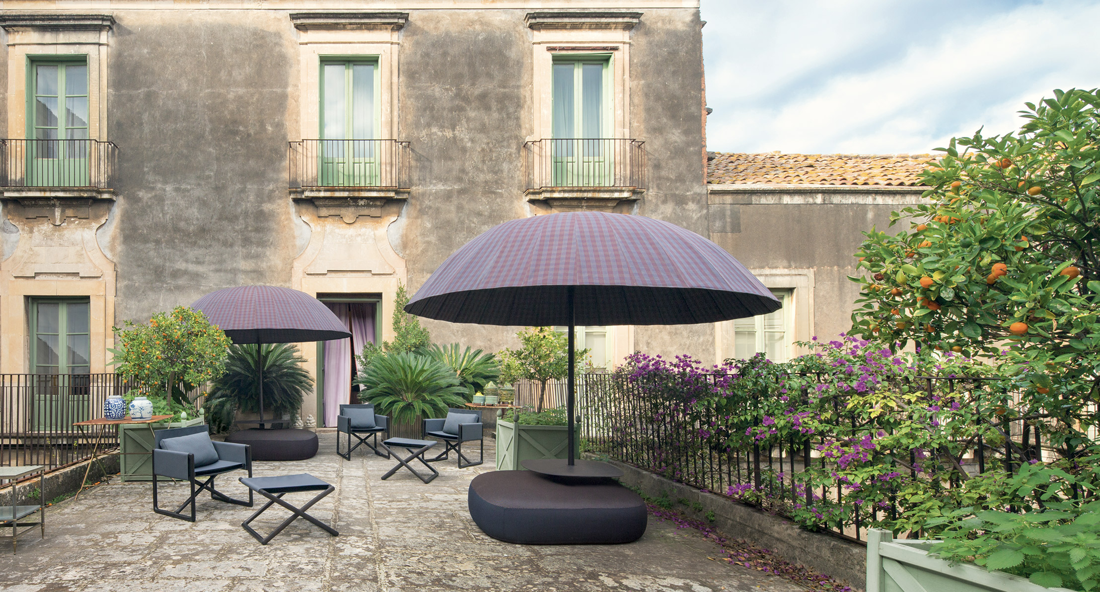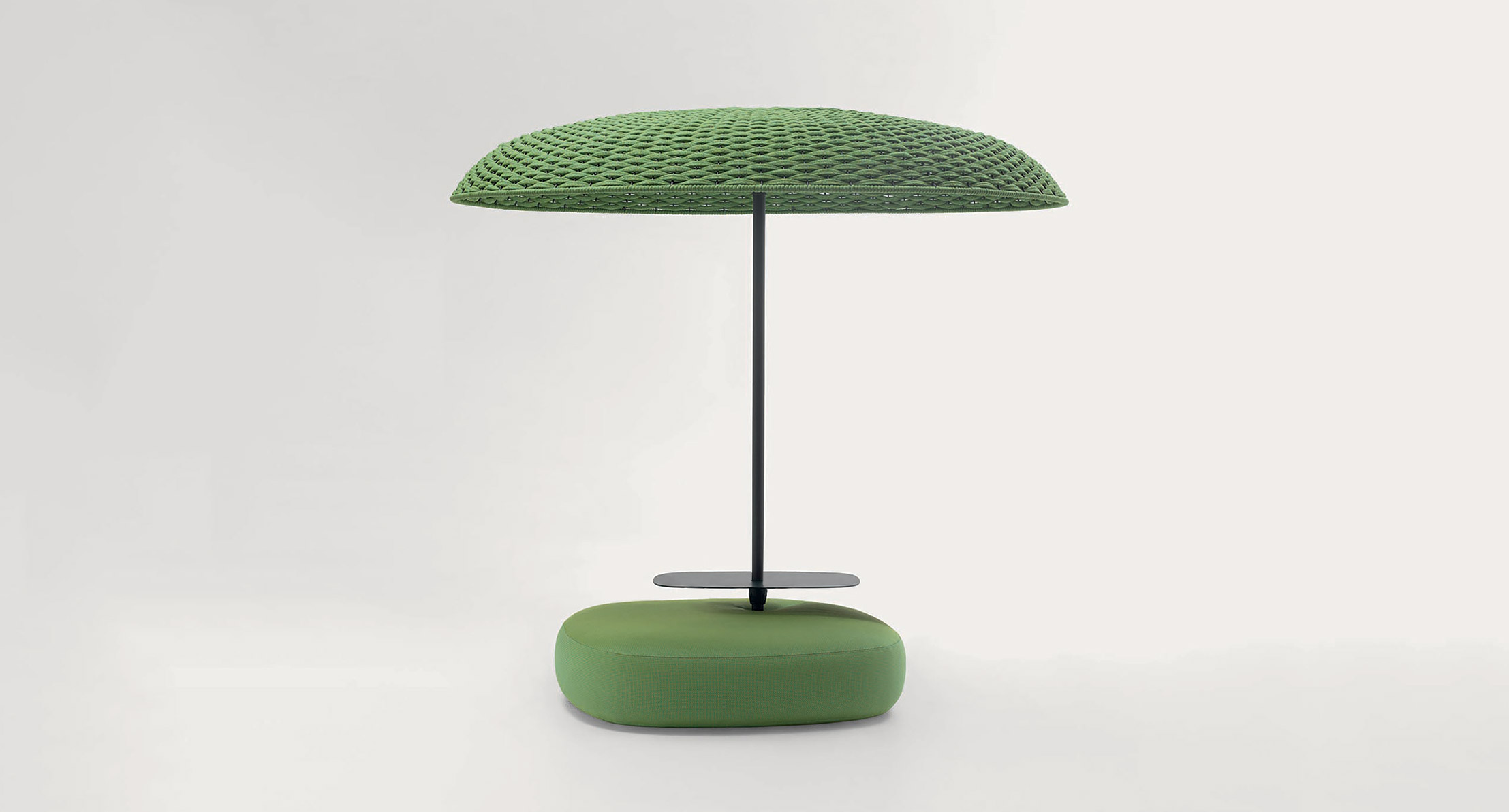 Note: gli elementi di seduta si posizionano attorno alla struttura portante del parasole grazie a un incavo ricavato nell’imbottitura.