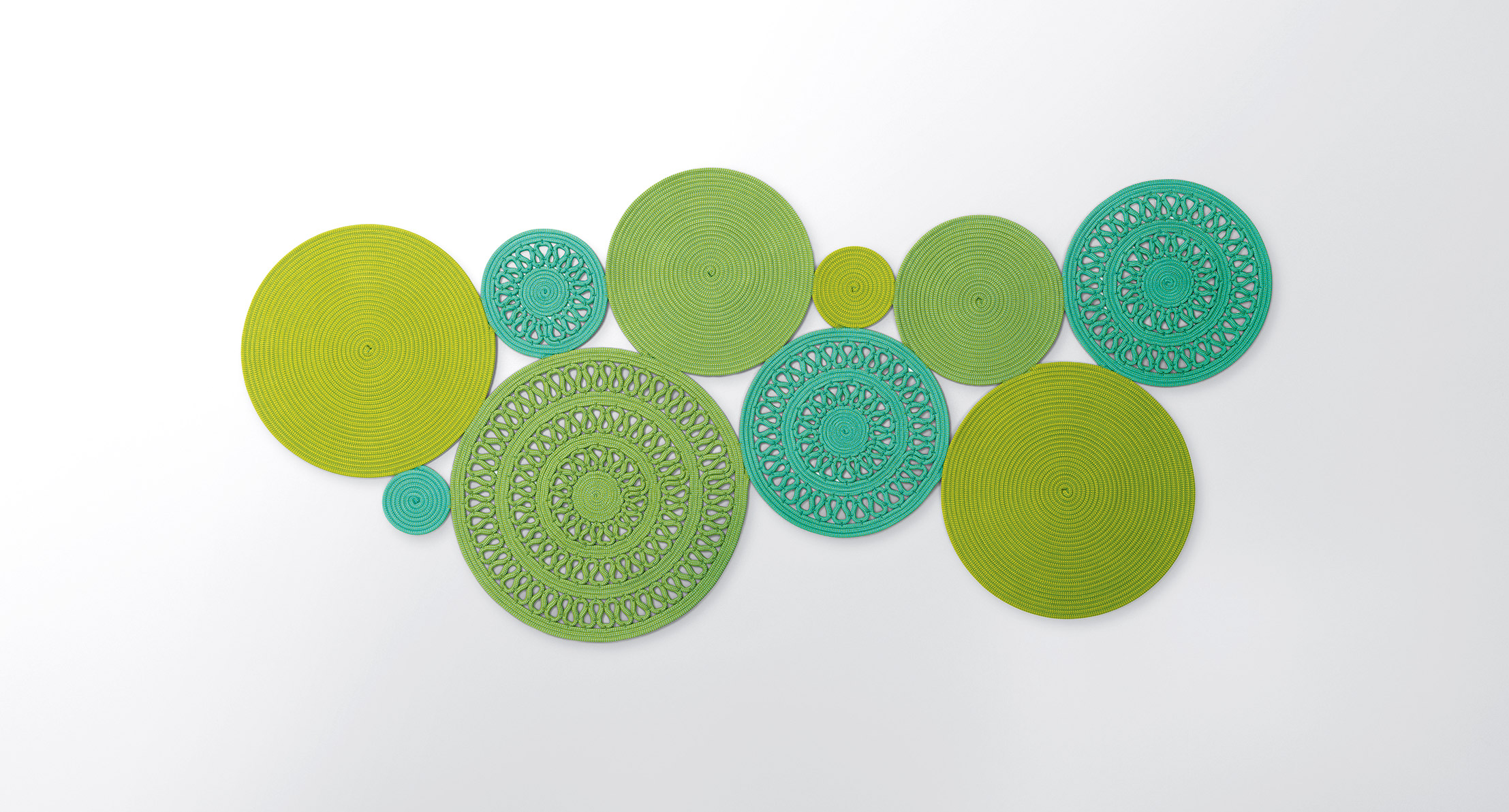 I motivi che costituiscono la superficie del tappeto sono realizzati interamente a mano e presentano dimensioni e lavorazioni diverse: per alcuni, la corda è cucita a spirale, per altri è disposta a formare moduli tondi decorati.