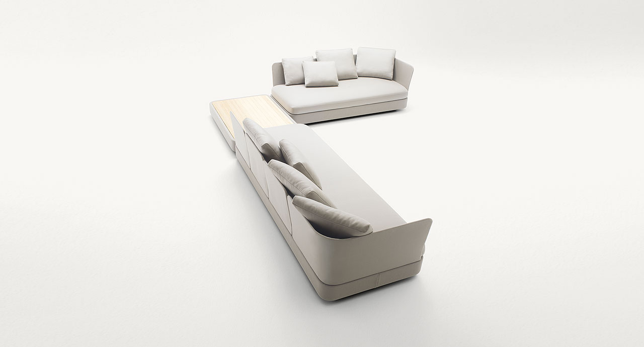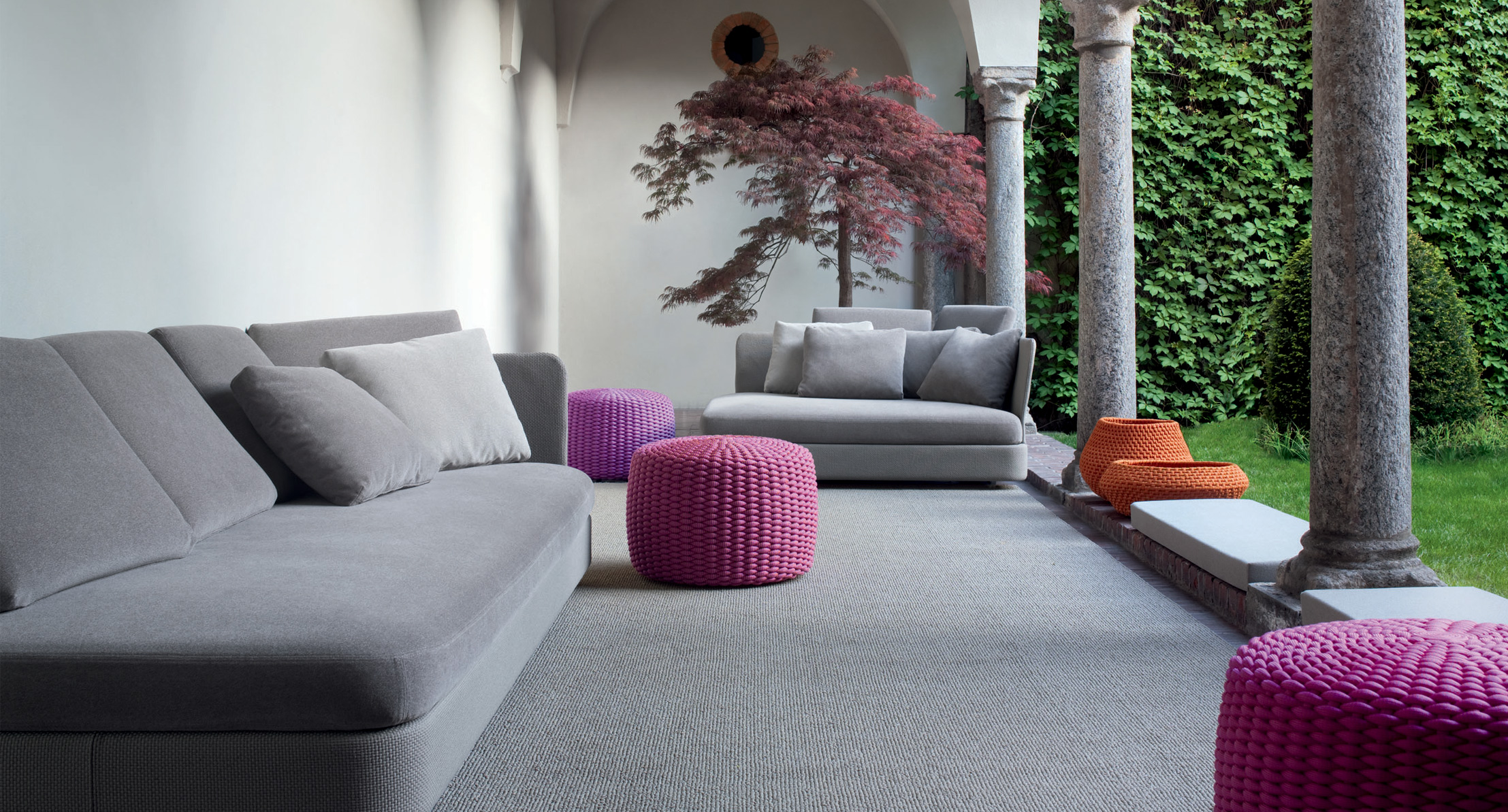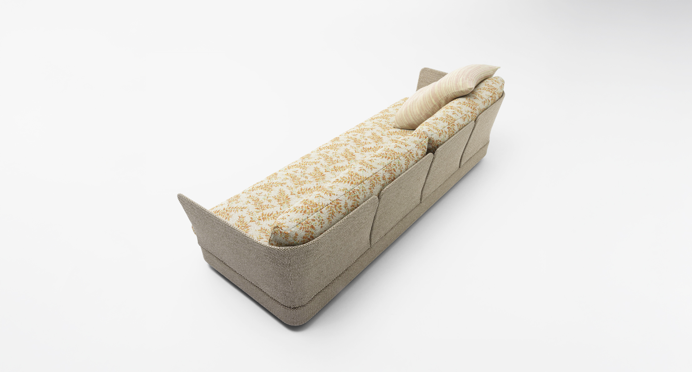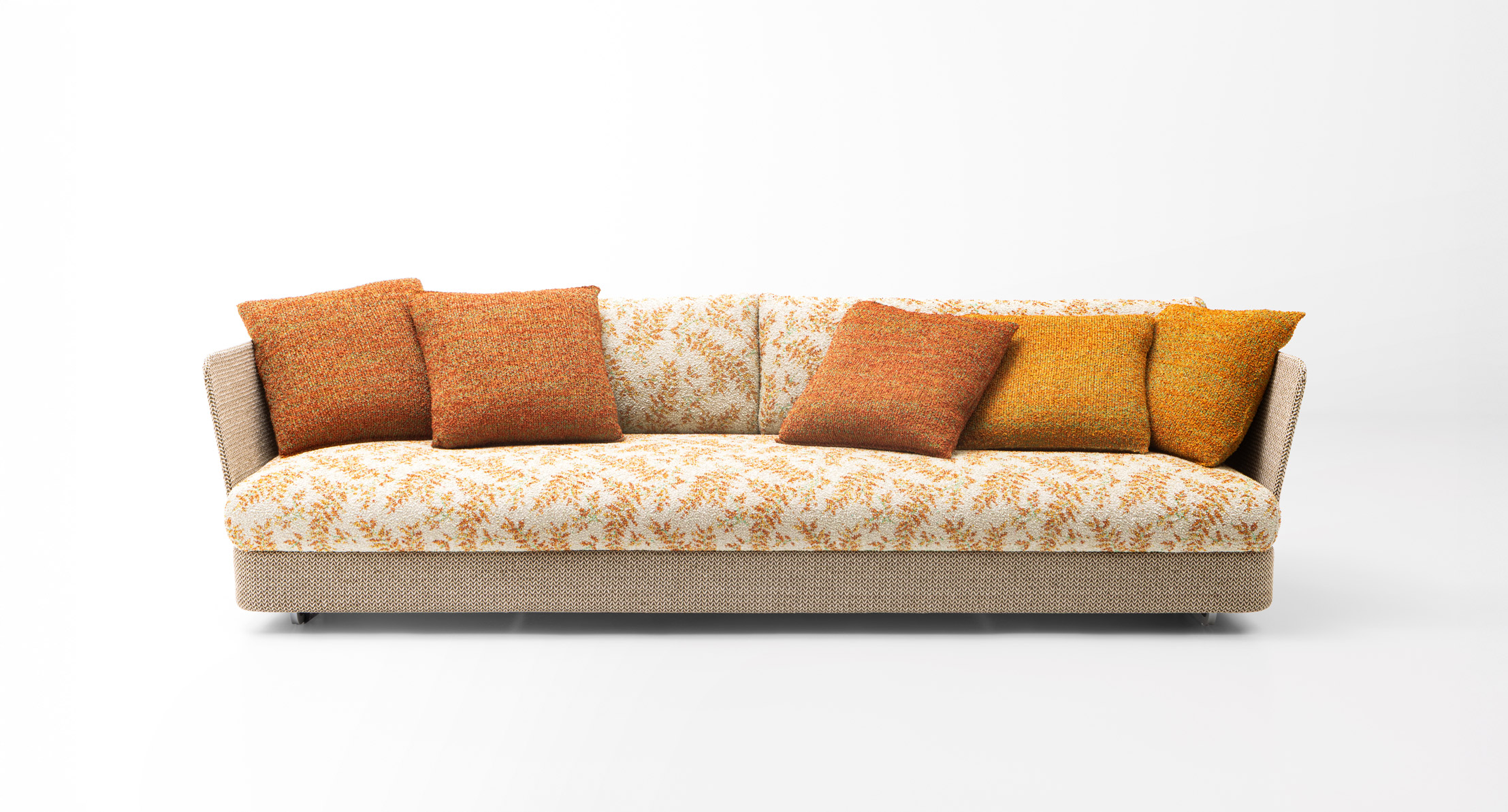 La struttura, gli schienali e i braccioli di Cove sono normalmente rivestiti con lo stesso tessuto; nel caso si scegliesse il tessuto Rope M per la struttura, va considerato che schienali e braccioli saranno sempre realizzati in tessuto Rope T.