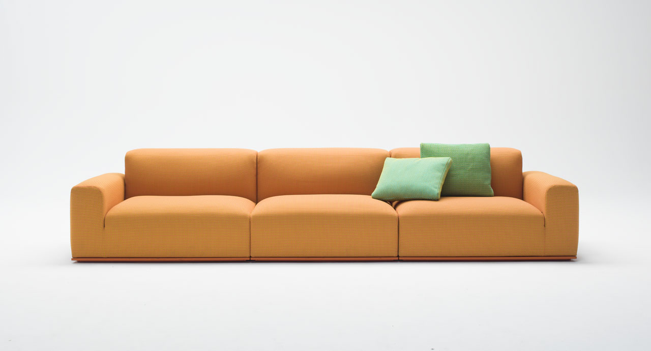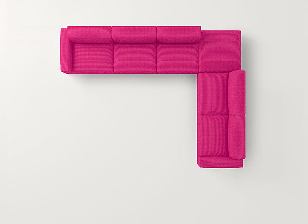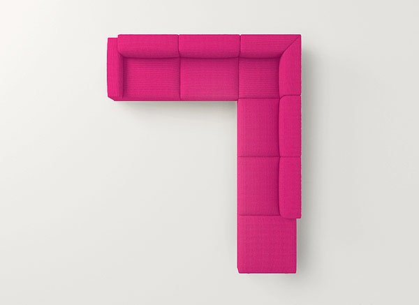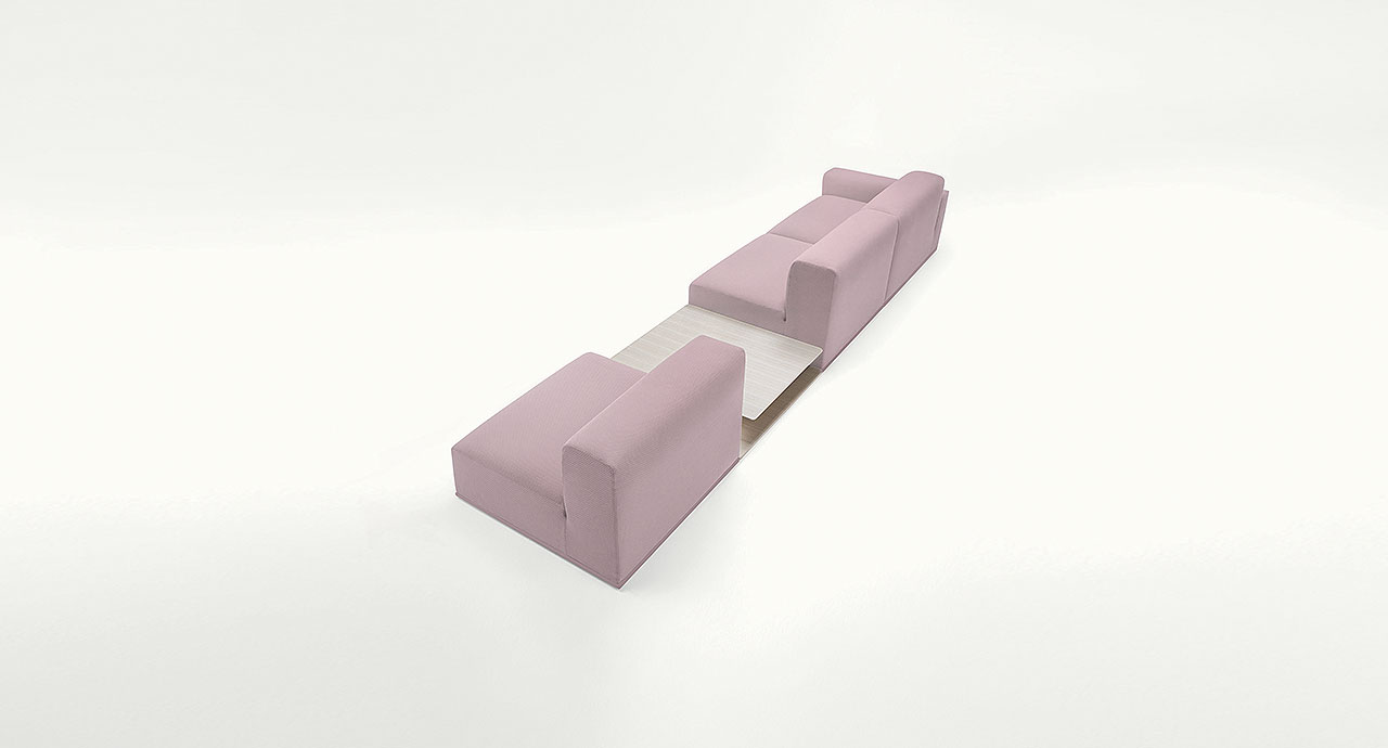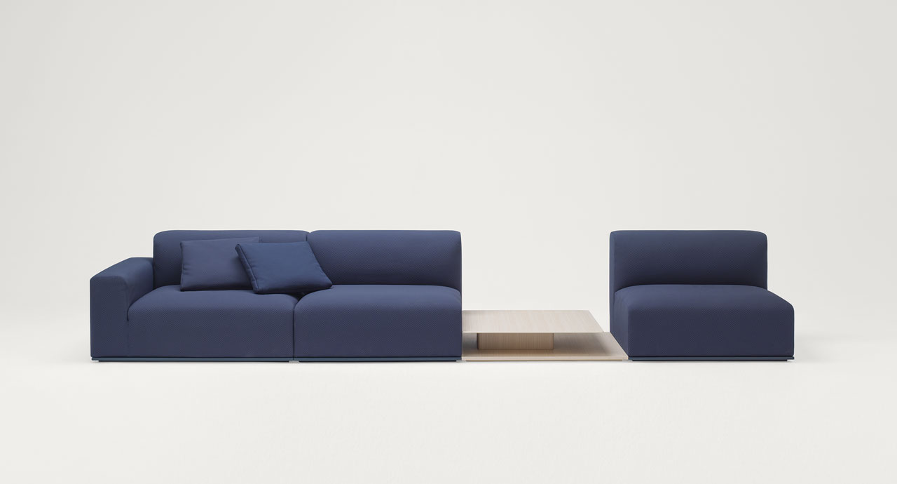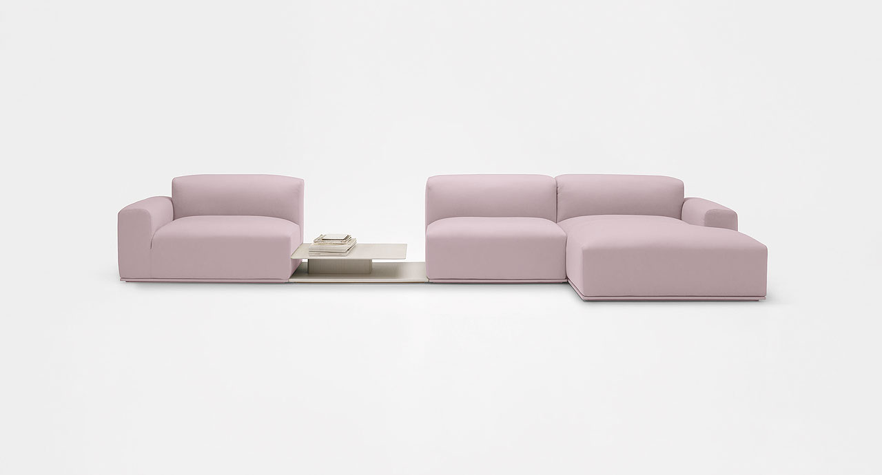 Sistema di sedute modulari composto da elementi con bracciolo, elemento centrale e angolare, chaise longue e pouf. La serie Cover comprende anche un tavolino di servizio in legno.