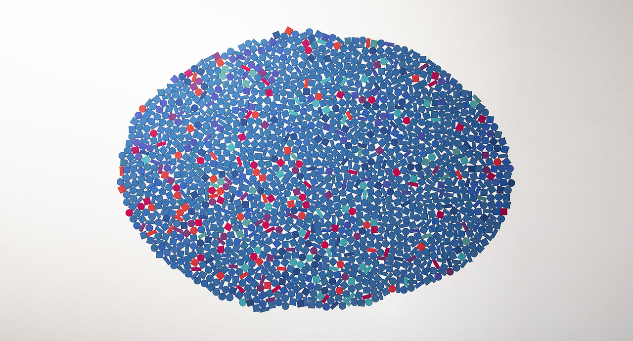 Tappeto modulare realizzato dall’unione di elementi di forma tonda, quadrata e rettangolare.