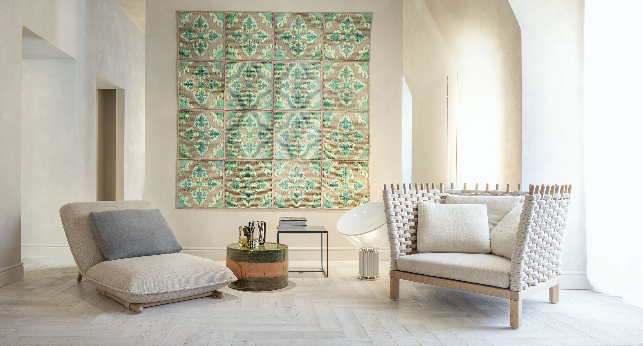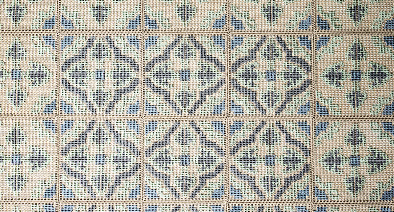 Donna Florio è un tappeto modulare per esterni e interni con decorazione realizzata a mano.