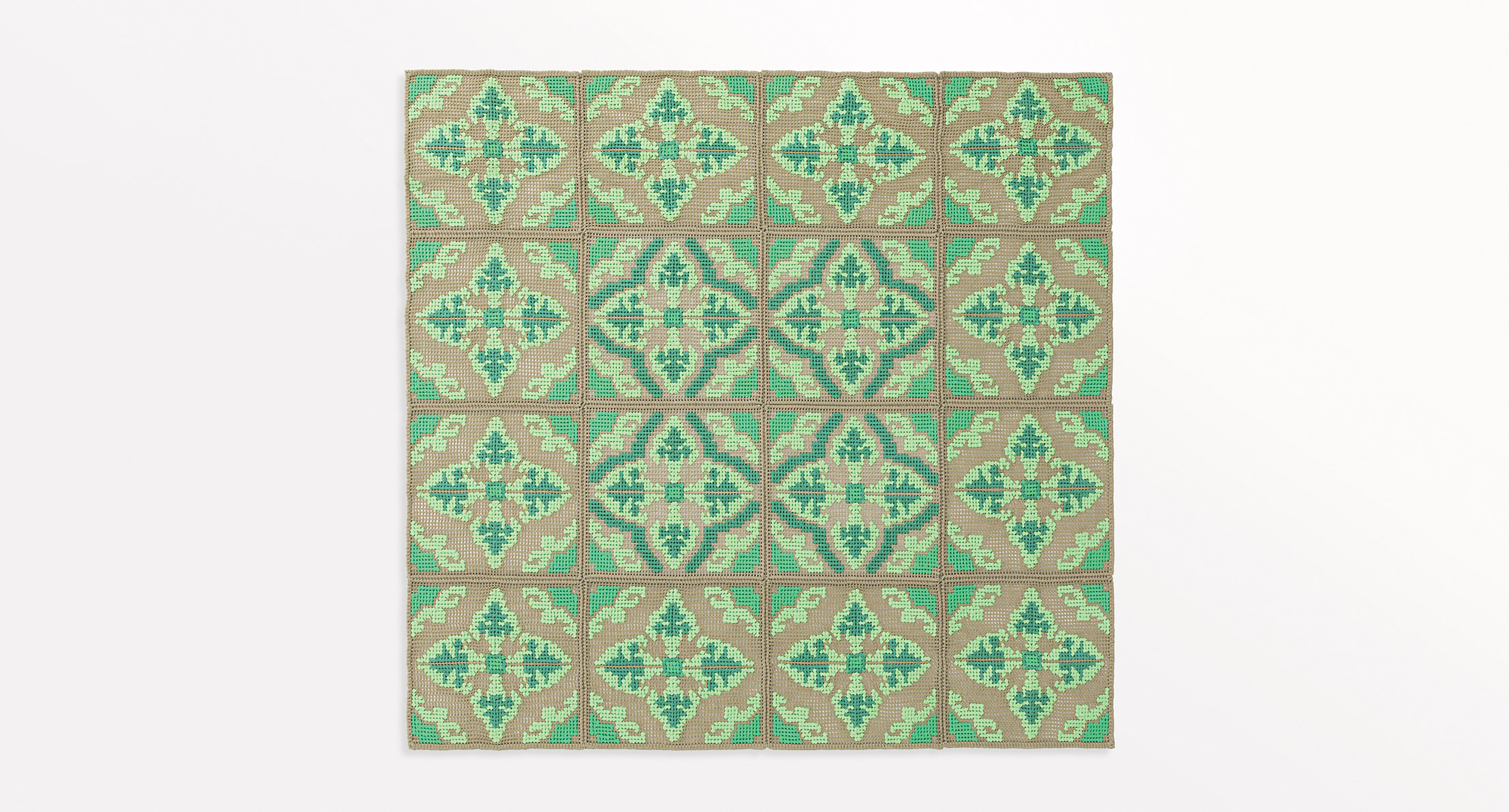 Il ricamo viene eseguito con una treccia piatta tinta unita o bicolore in filato Rope su elementi colore sand di cm 50 x 50 ciascuno, che costituiscono il backing del tappeto.