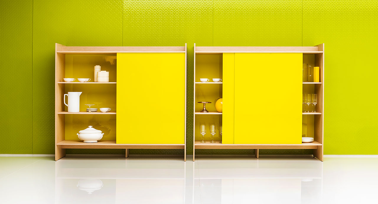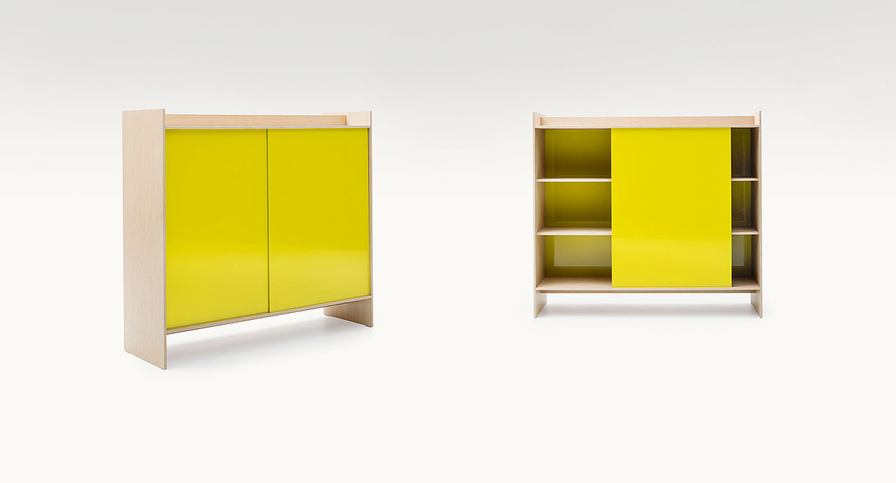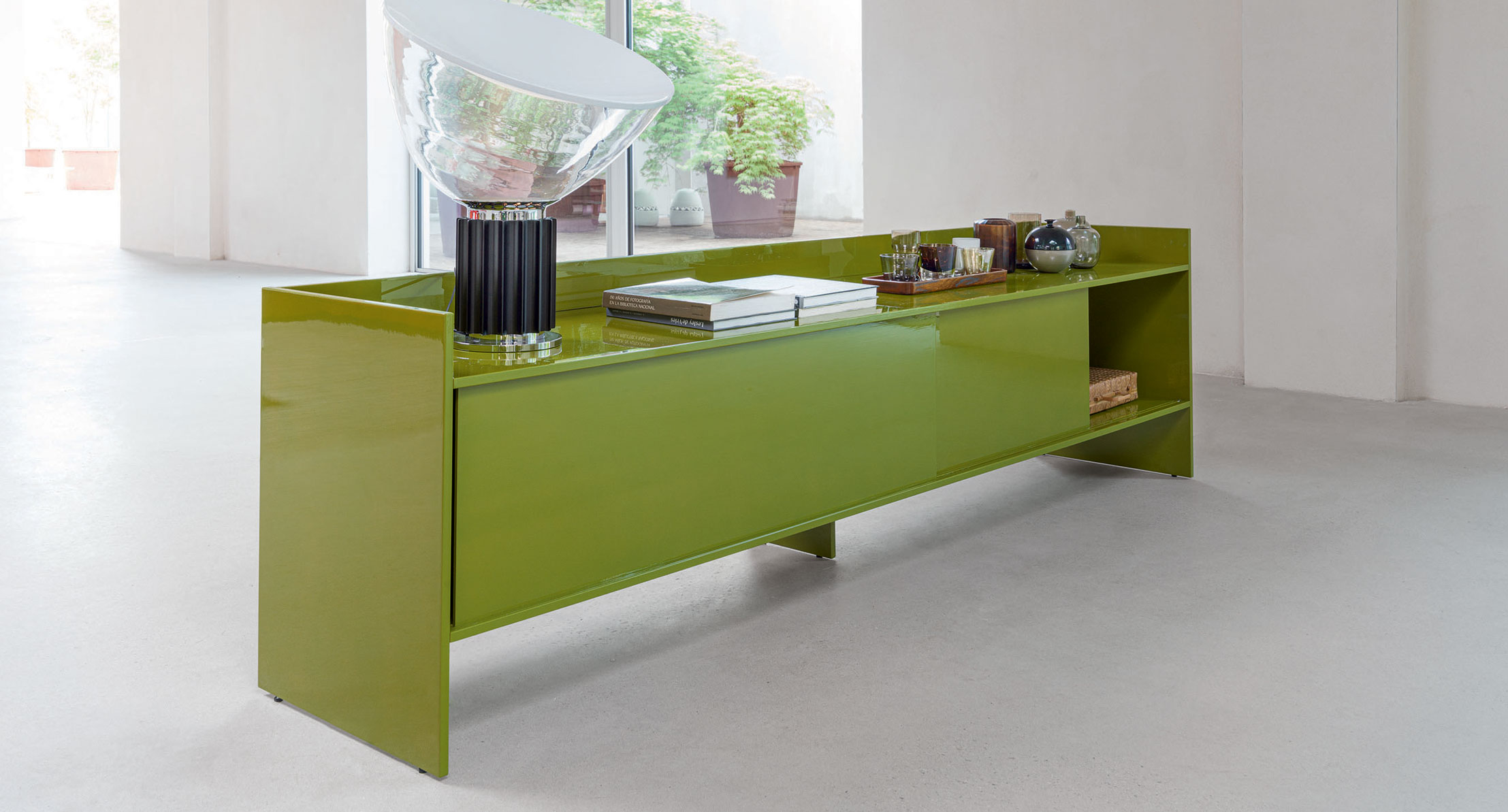 Serie composta da madie, mobili contenitori bassi e librerie.