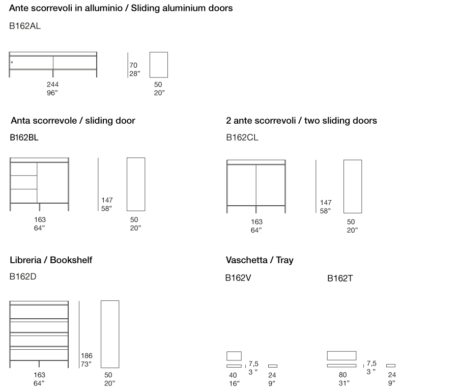 Pannello di schienale e ante scorrevoli: in alluminio finito Mano Lucida o laccato opaco.