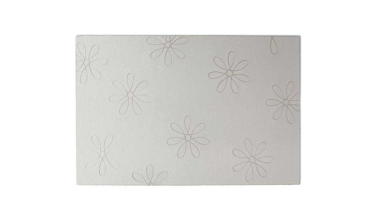 Flower è un tappeto in feltro realizzato con ricamo a punto Passafilo, eseguito con filo di poliestere e nastro in poliolefine.