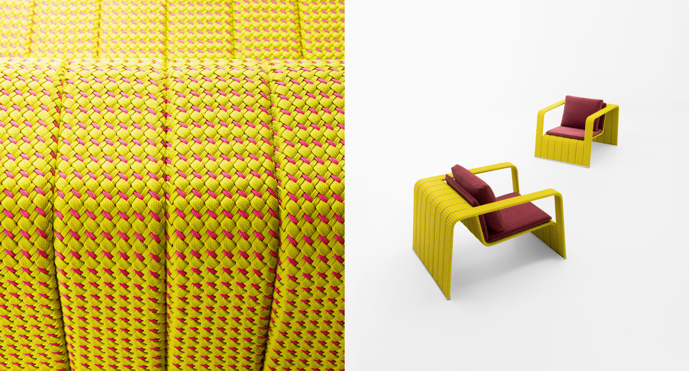La serie Frame comprende anche sedia, chaise longue, piattaforme, panche, tavolini ed elementi modulari.