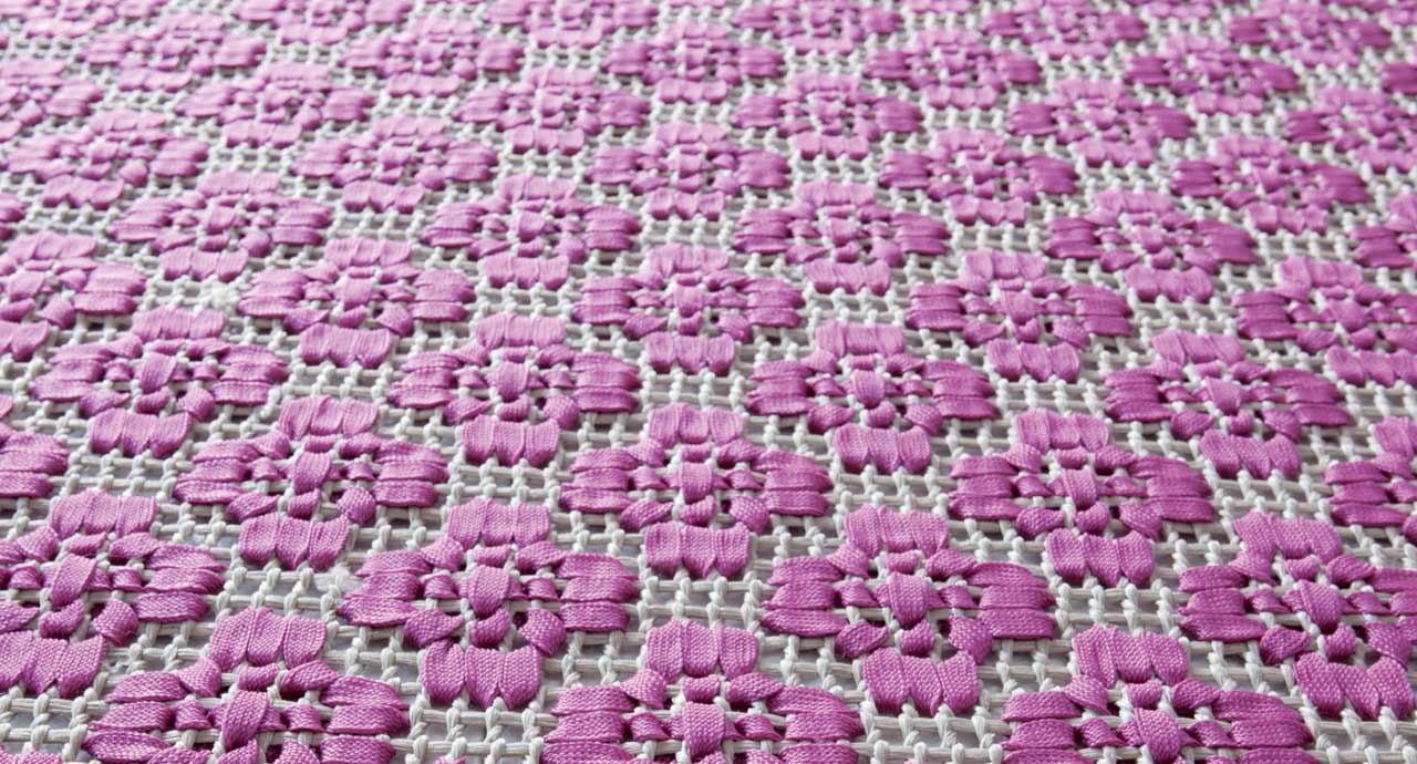 Il ricamo viene eseguito con una treccia piatta tinta unita o bicolore su di una rete di supporto che forma il backing del tappeto.