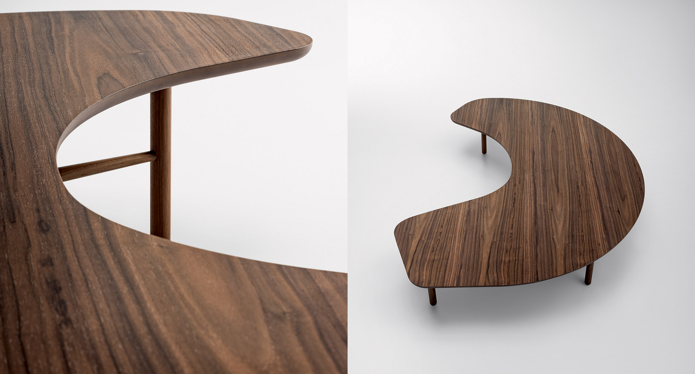Half Moon è un tavolino la cui forma evoca la mezzaluna, un motivo che nel lavoro di Greta Magnusson Grossman compare frequentemente. Ogni dettaglio è studiato con cura e trasmette la leggerezza e la purezza che caratterizzano il suo stile. I bordi smussati del piano e le giunzioni delle gambe, che si assottigliano nel punto di incastro, esprimono maestria progettuale ed equilibrio.