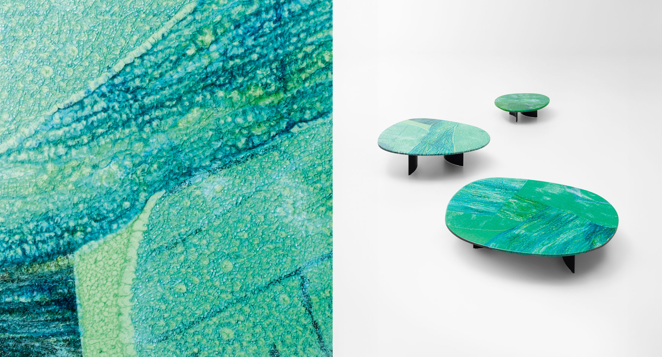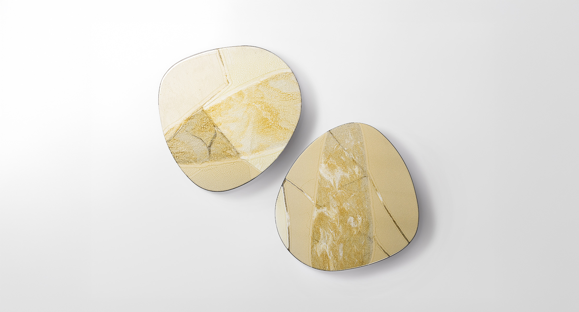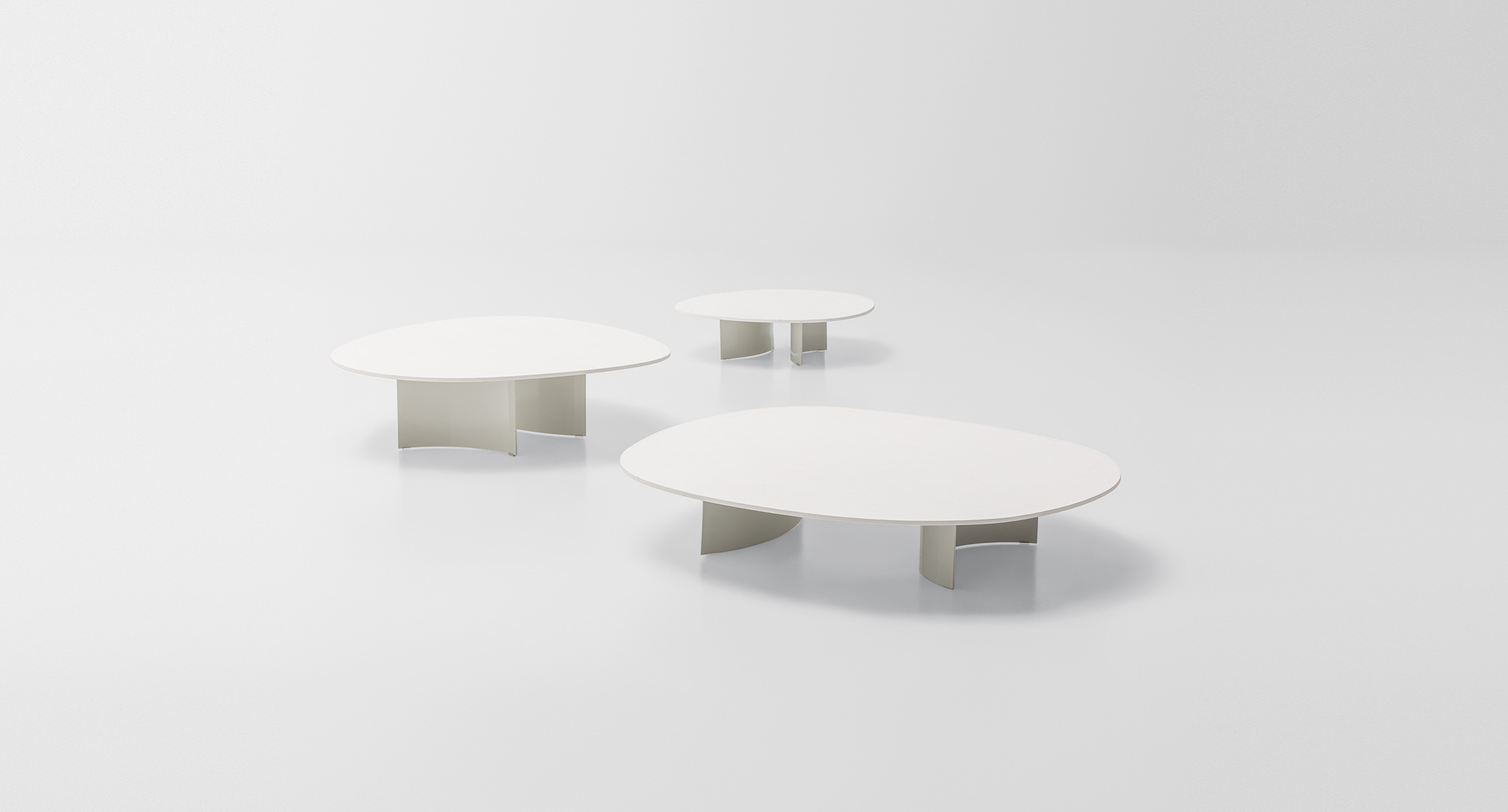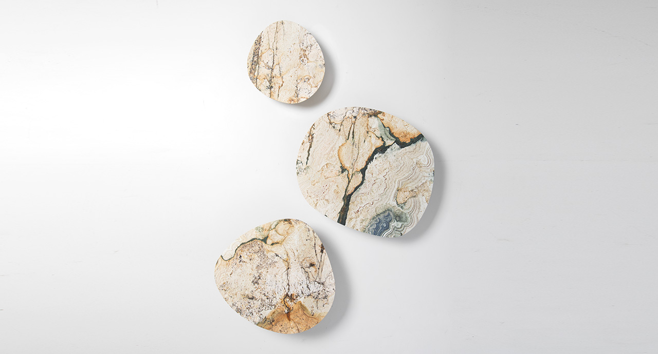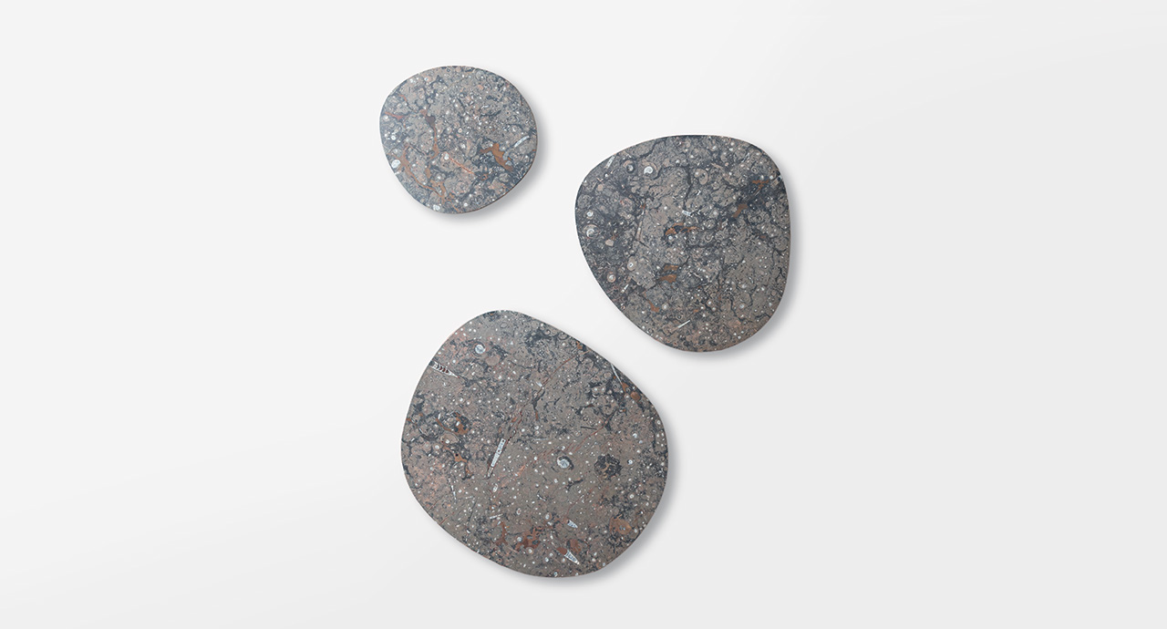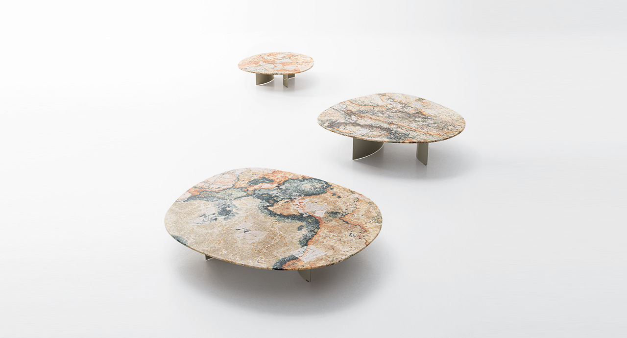 I piani dei tavolini Isole sono disponibili in due versioni: leggermente bombati, in Pietra di Comiso, oppure completamente piatti, in pietra Sinai, marmo o Sciara.