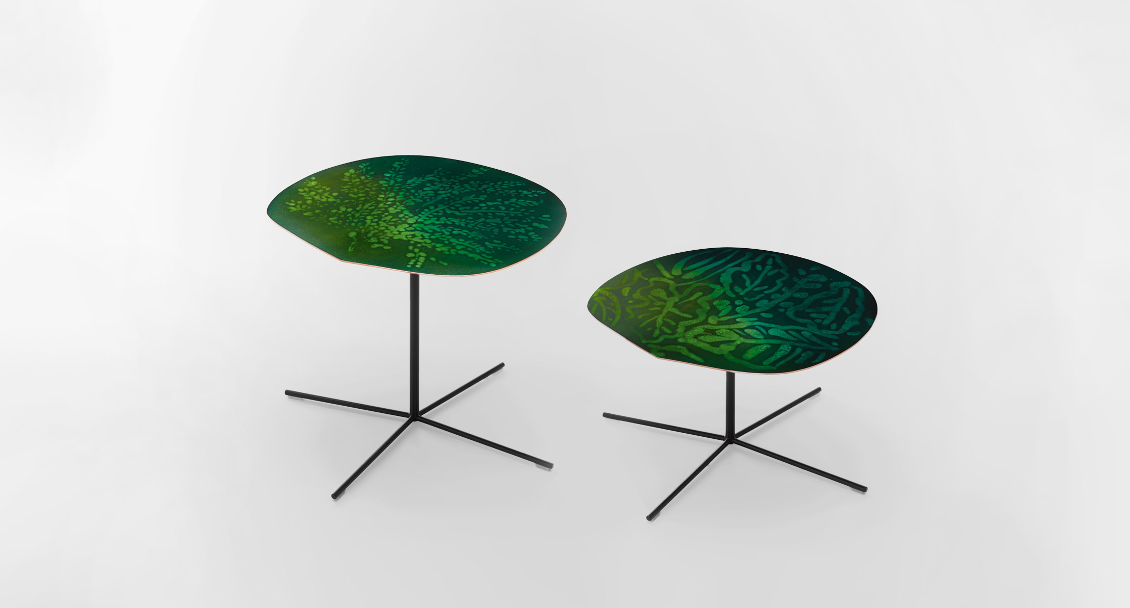 Tavolini con piano in rame e acciaio smaltato Esmal.