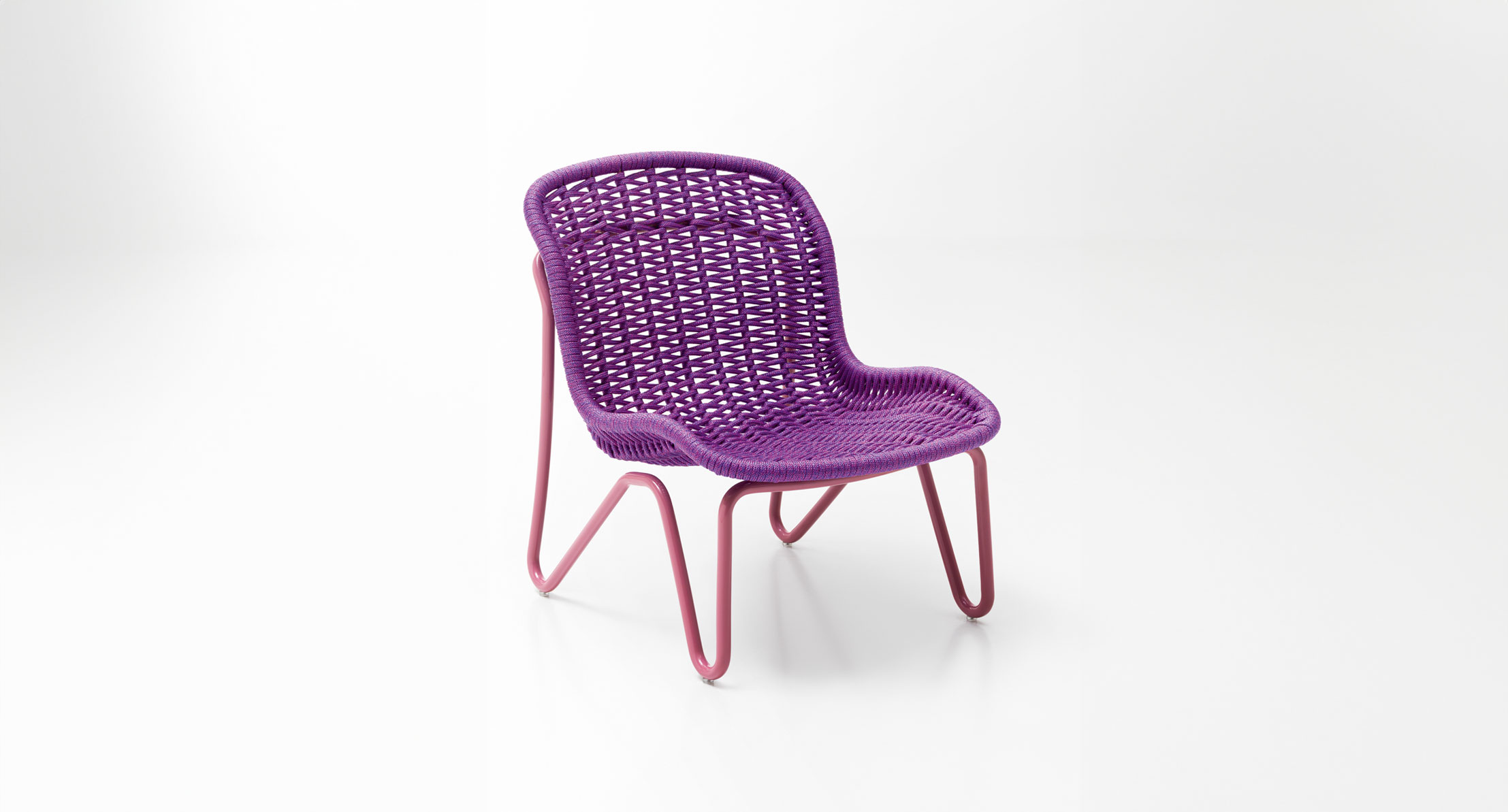 Poltrona e poltrona bassa con rivestimento fisso intrecciato a mano sulla struttura.