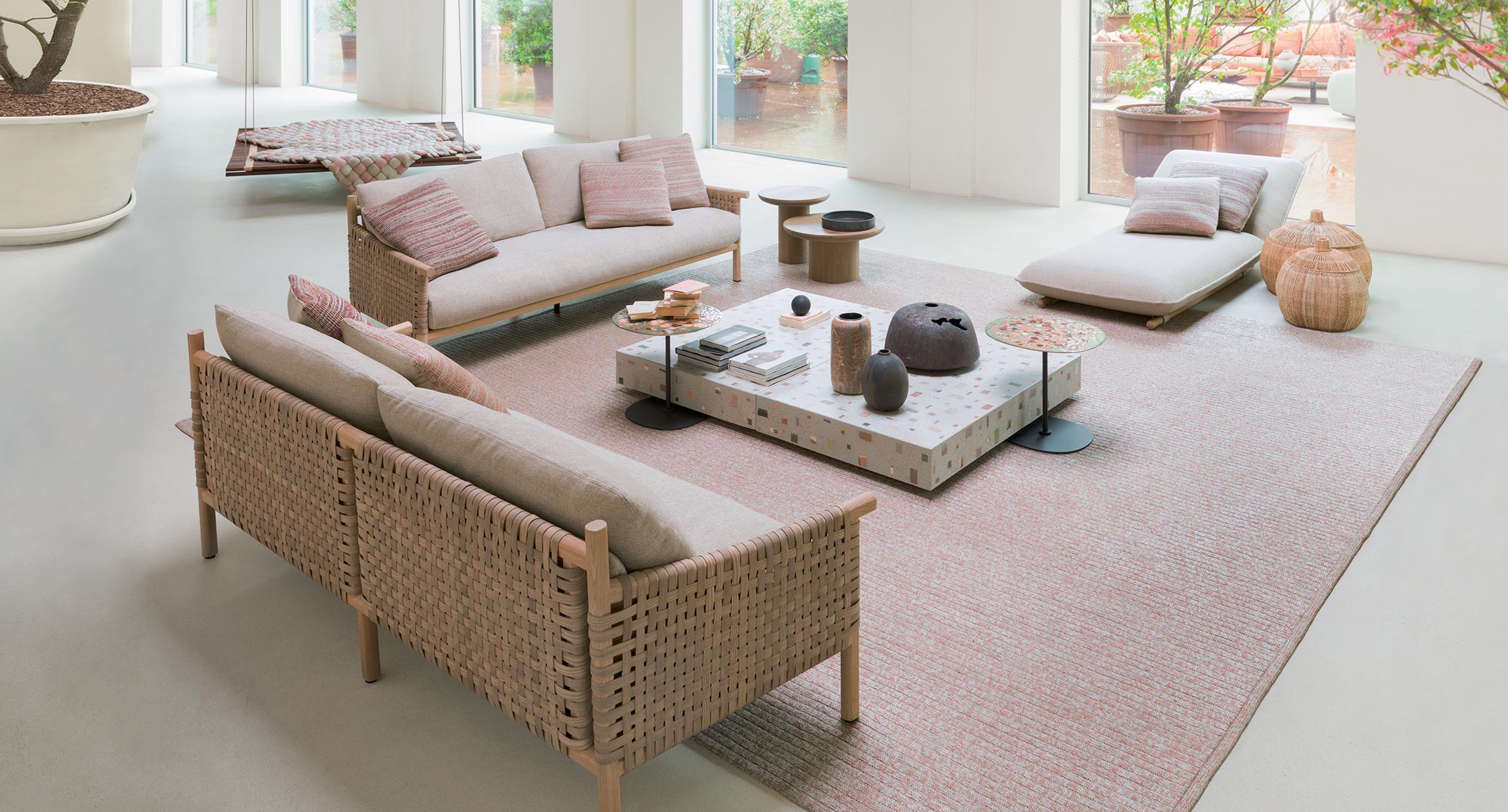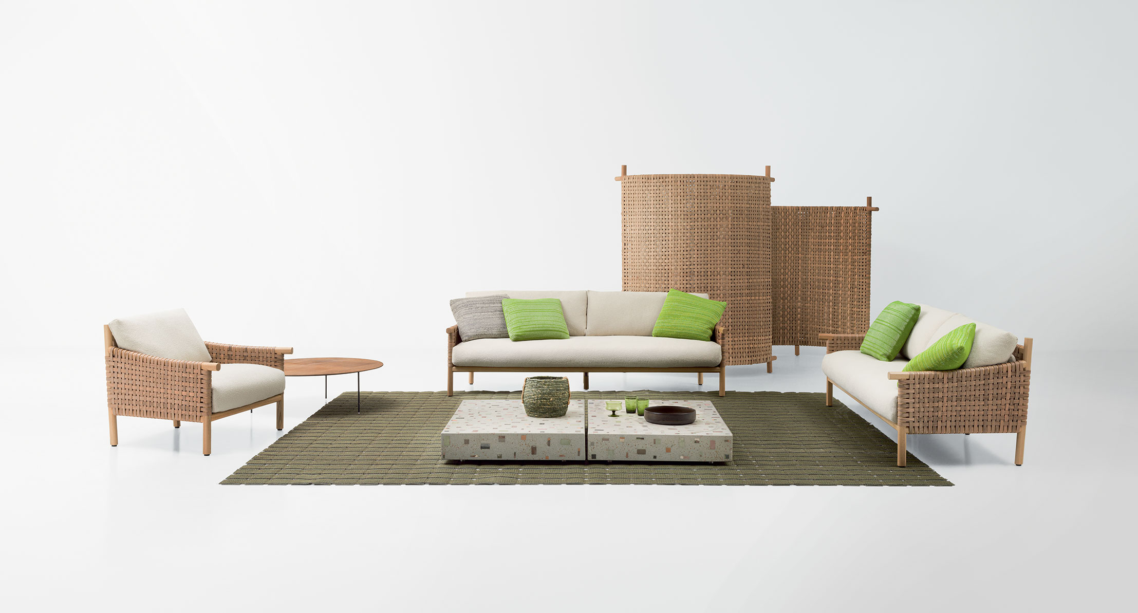 La serie Kiori comprende anche una poltrona e un paravento disponibile in due altezze.