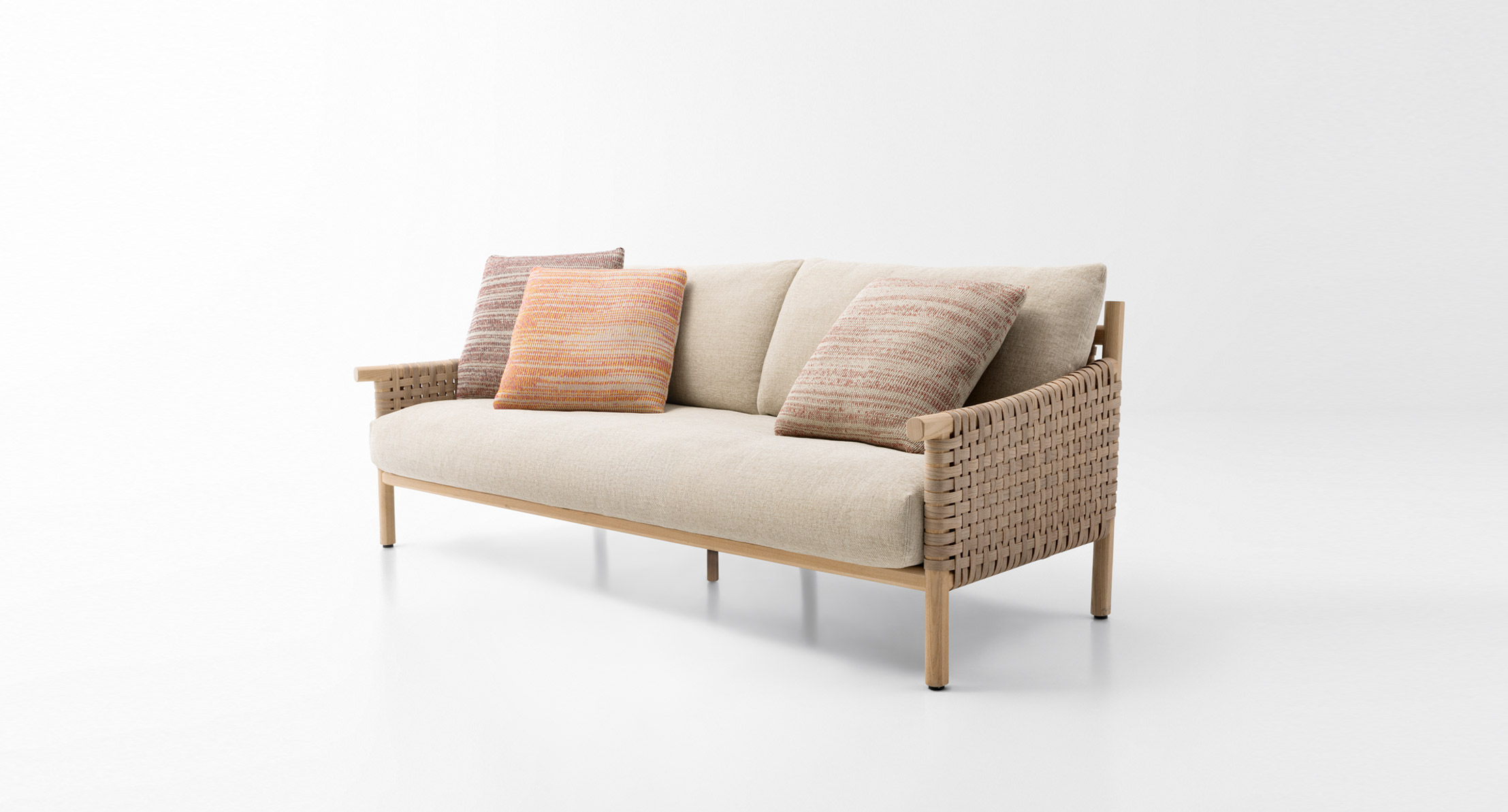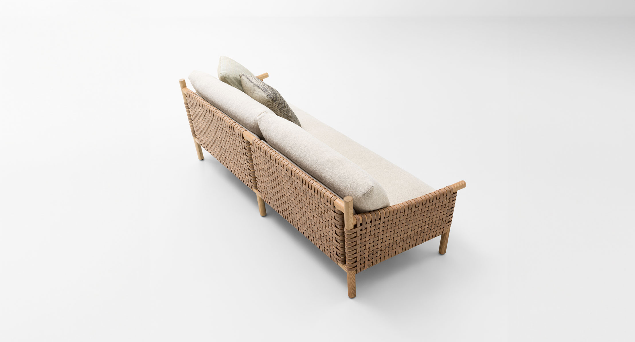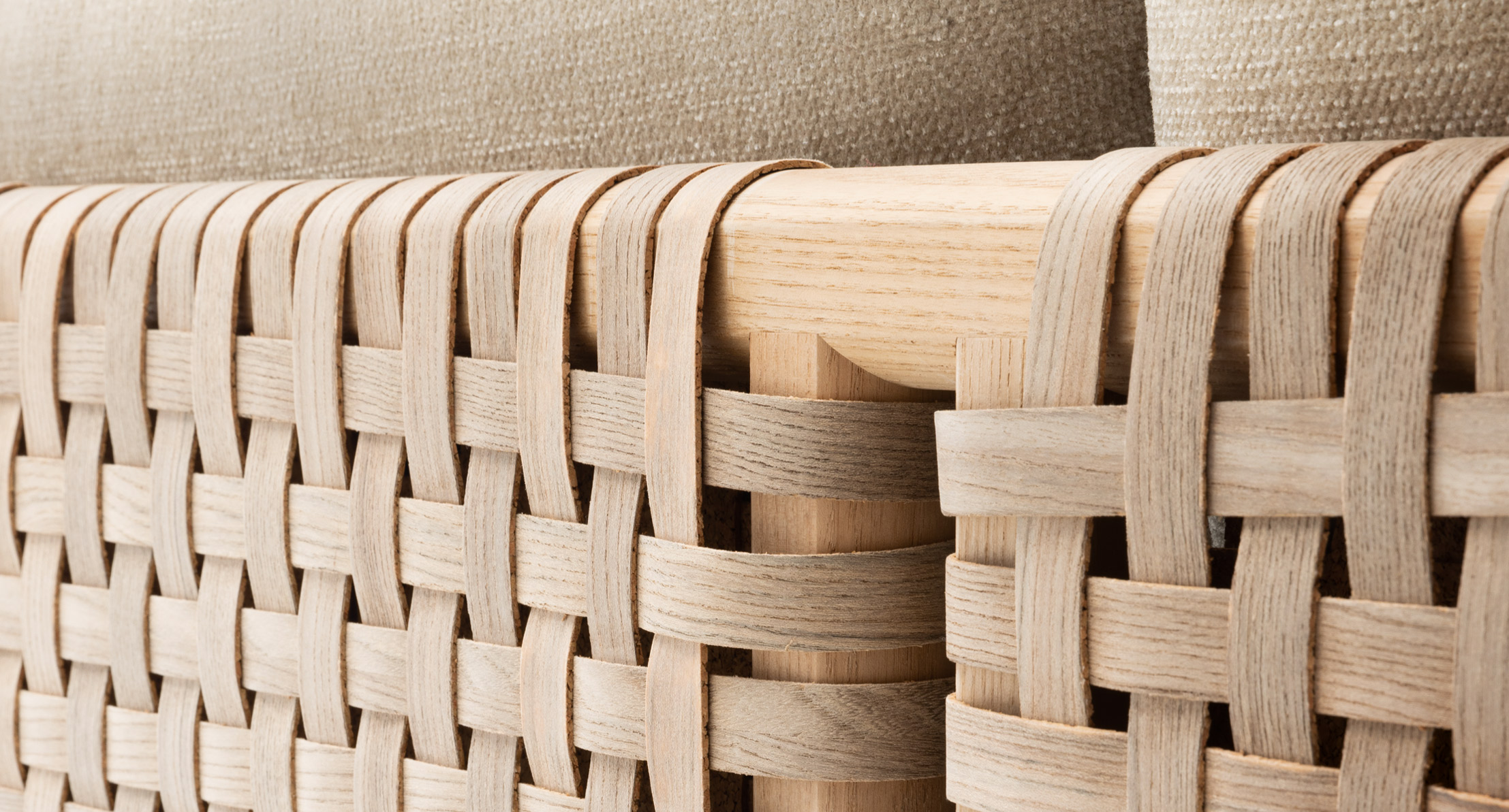 Rivestimento struttura: fisso, intrecciato a mano in Conwood, strisce di legno di frassino Abonos™ accoppiate a un supporto in sughero che le rende elastiche e al contempo resistenti.