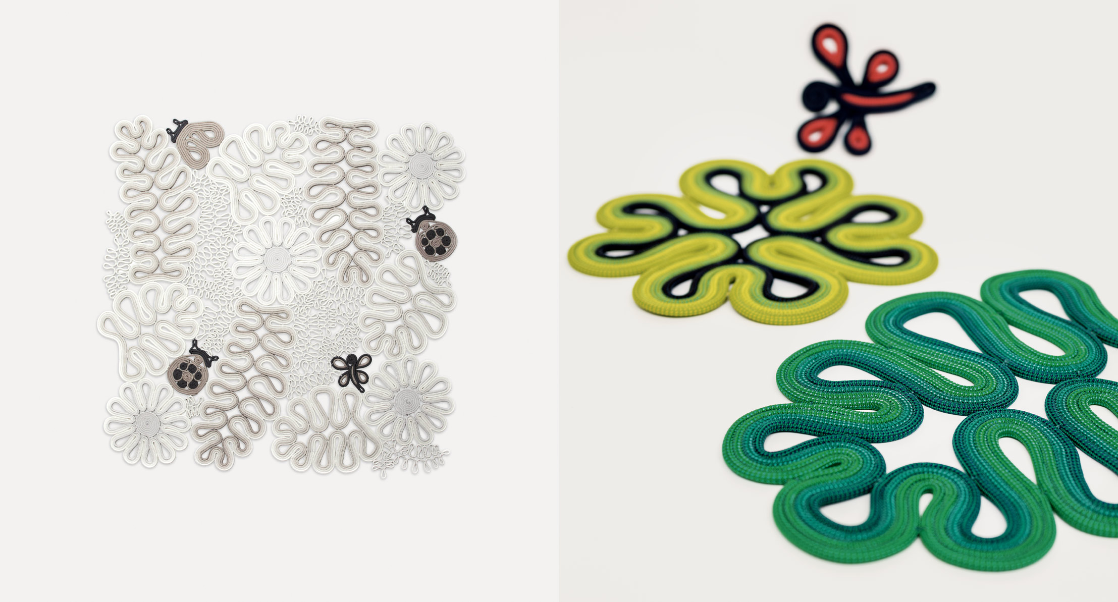 Gli elementi che costituiscono la superficie del tappeto sono ottenuti cucendo corde tinta unita e bicolore in filato Rope in modo da creare l’immagine di piante e animali.