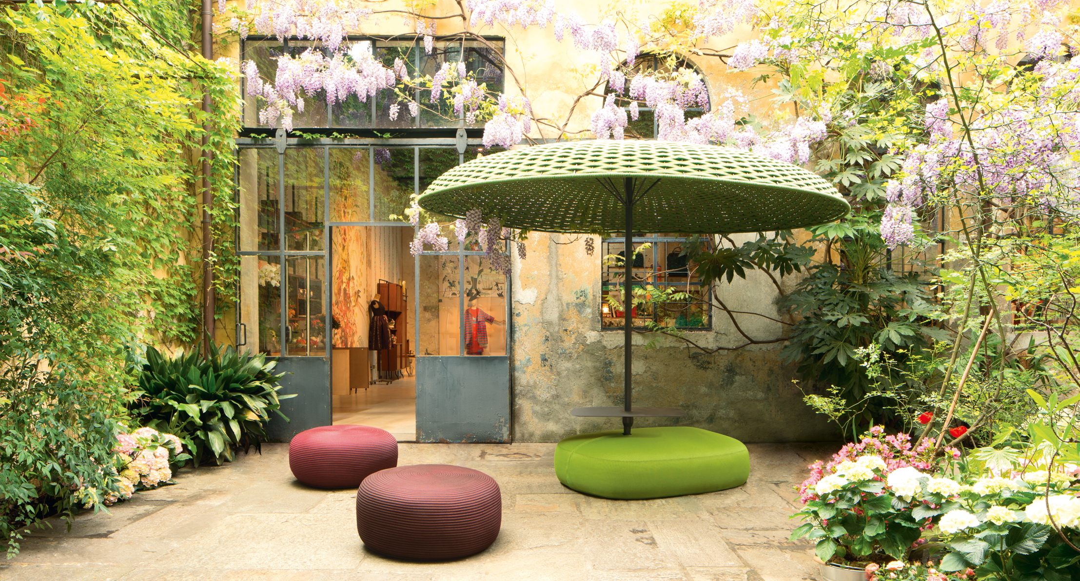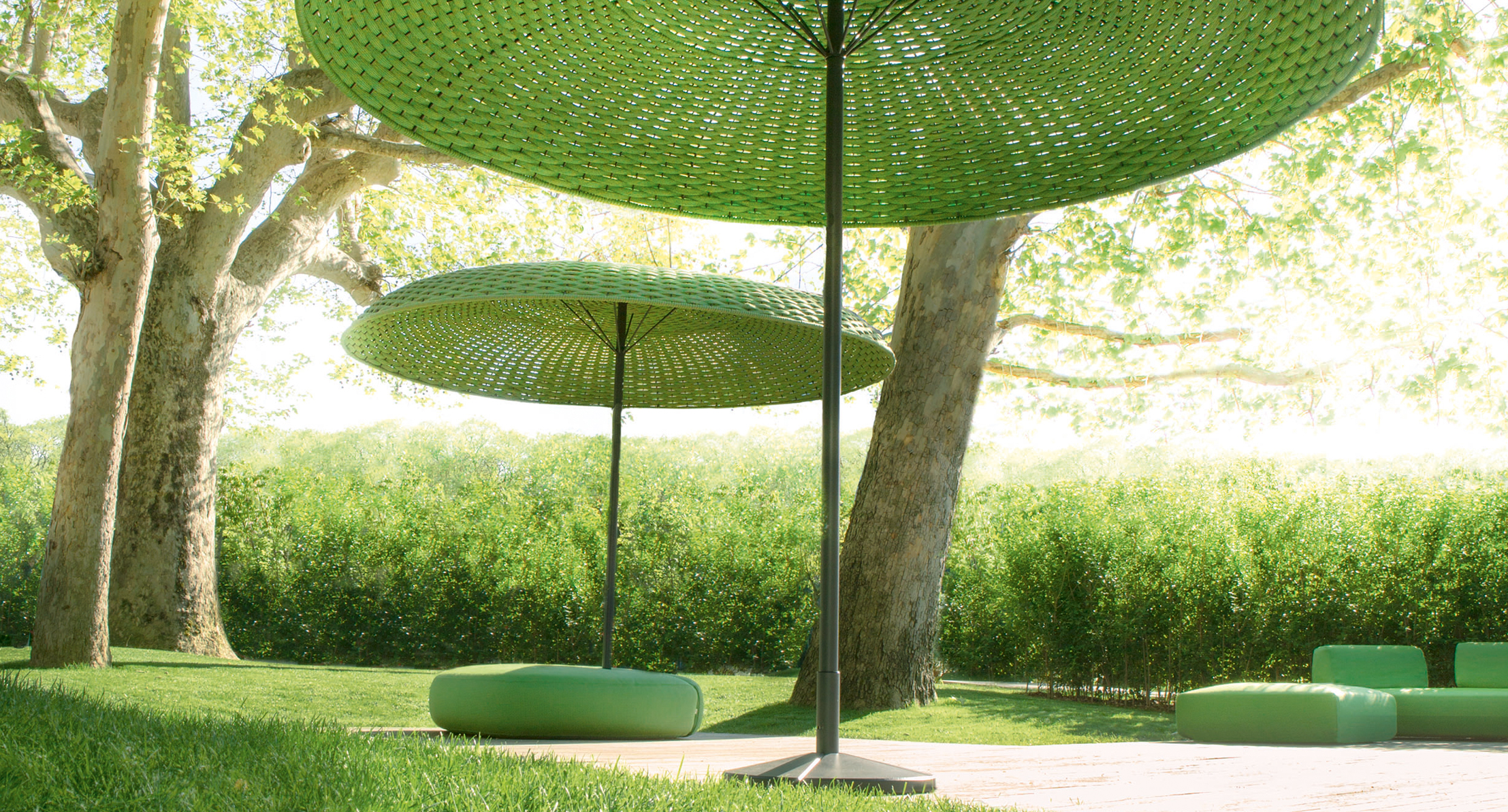 Parasole non richiudibile con rivestimento intrecciato a mano sulla struttura.