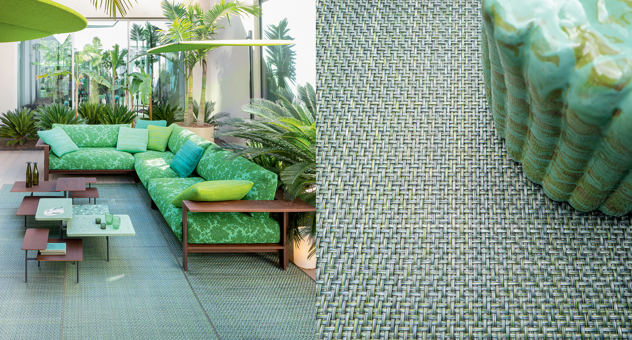 Tappeto modulare per esterni e interni disponibile in due versioni e realizzato dall’unione di strisce di larghezza cm 100 ciascuna tessute a telaio in filato Twitape.