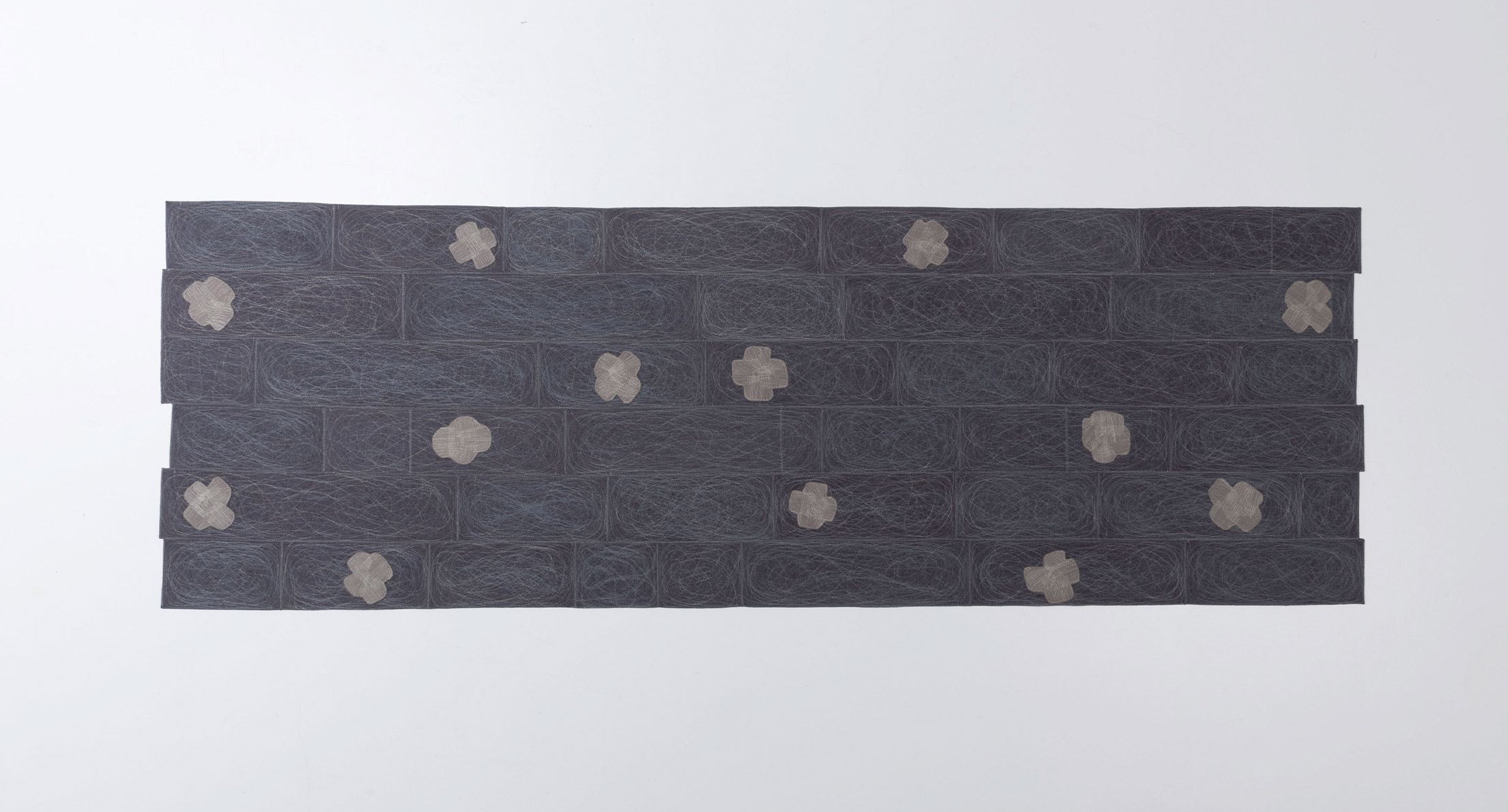 Decorazioni in feltro, che ricordano il profilo delle nuvole, sono a loro volte ricamate a macchina con un filo di un unico colore e successivamente cucite a punto Zigzag sugli elementi che formano la superficie del tappeto.