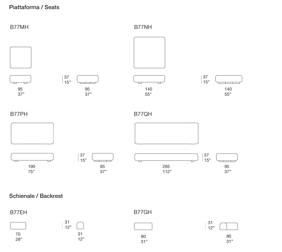 Rivestimento sedute e schienali: sfoderabile e disponibile nei tessuti indoor indicati qui sotto.